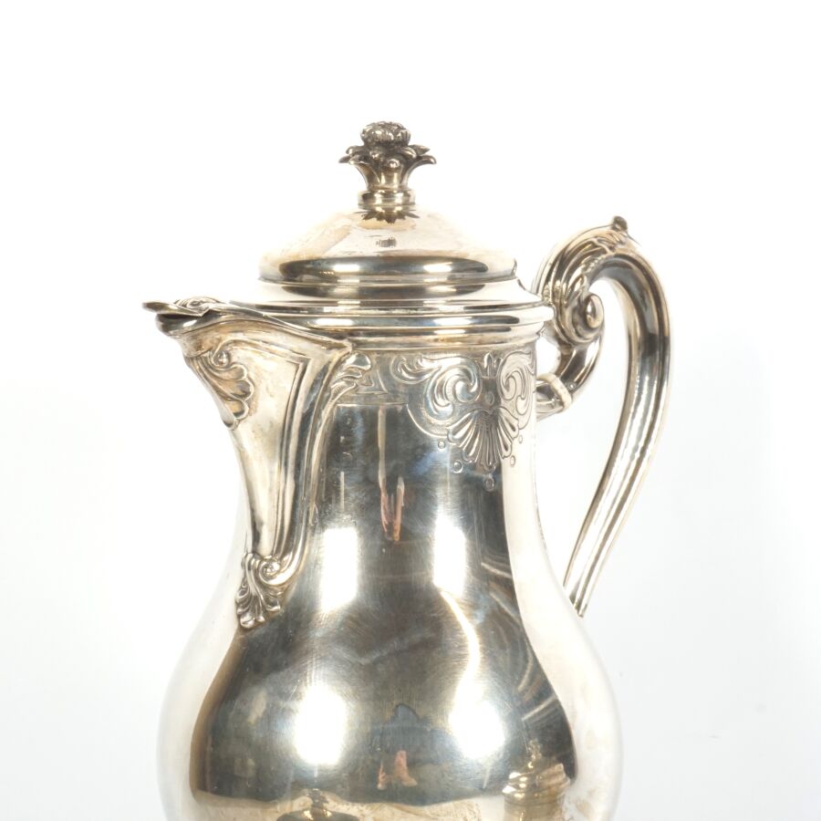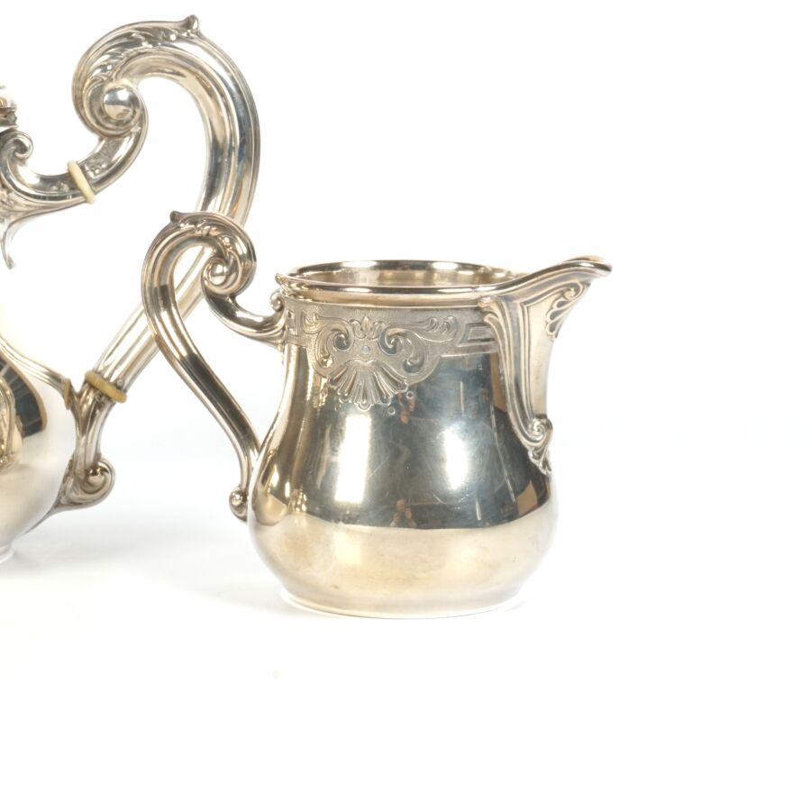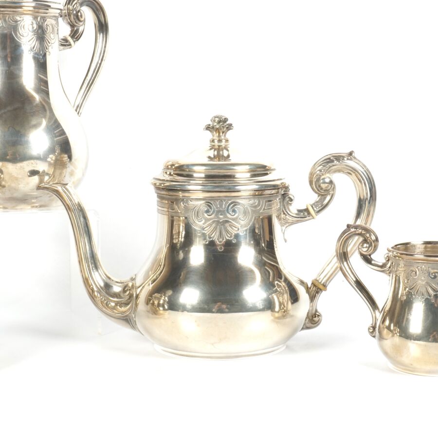 TETARD FRERES : Service à thé-café en argent, poinçon tête de Mercure (950/oo) à décor ciselé de coquilles éclatées et feuillages, le fretel à motif d'un fruit, comprenant deux verseuses, un pot à lait et un sucrier, Poids brut : 1 898 g environ.