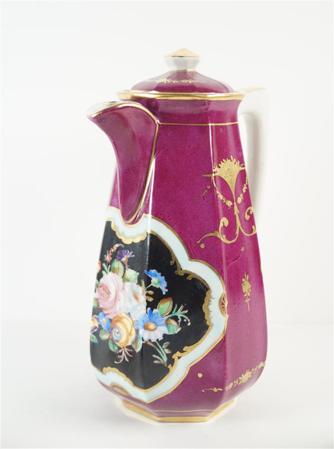 Tête à tête en porcelaine polychrome à décor en réserve de fleurs rehaussées à l'or sur fond fuchsia, comprenant une cafetière, un sucrier, deux tasses et soucoupes, porte une marque de Sèvres au-dessous, H. théière : 24 cm.