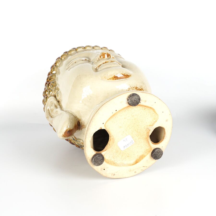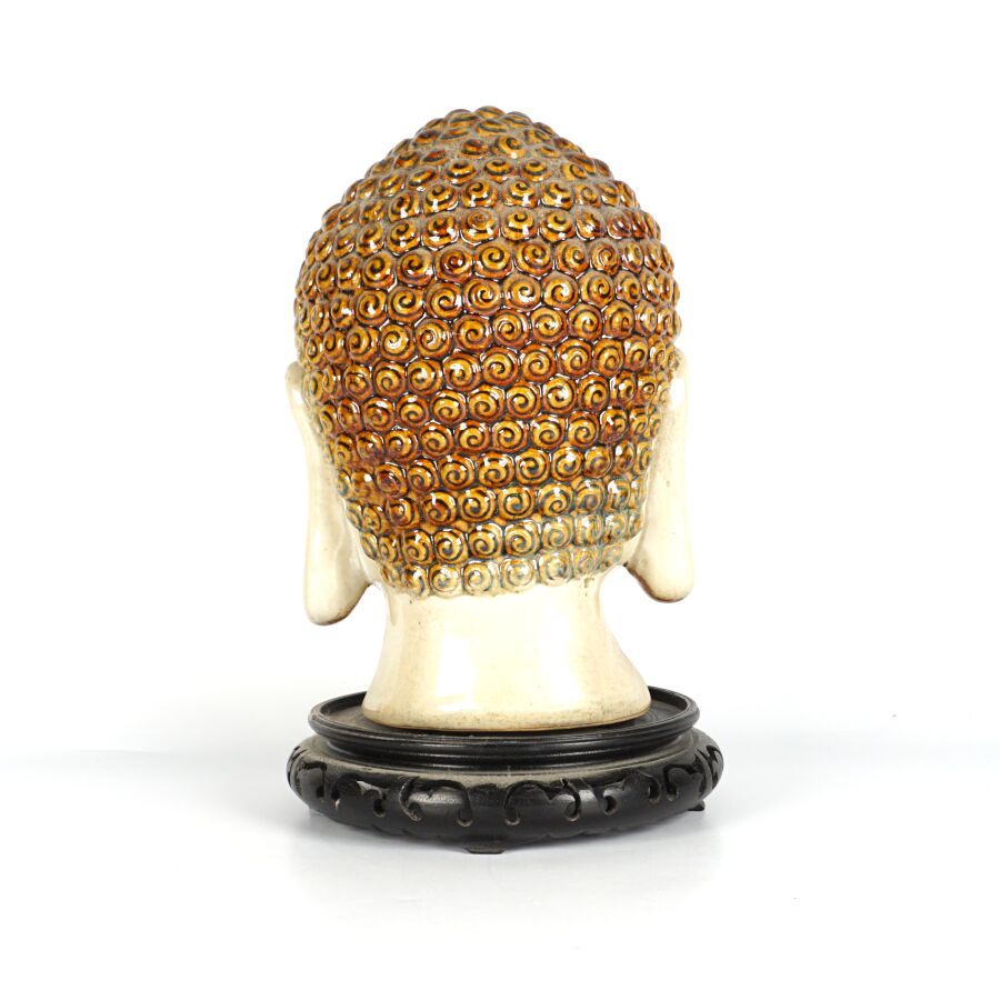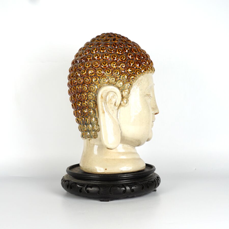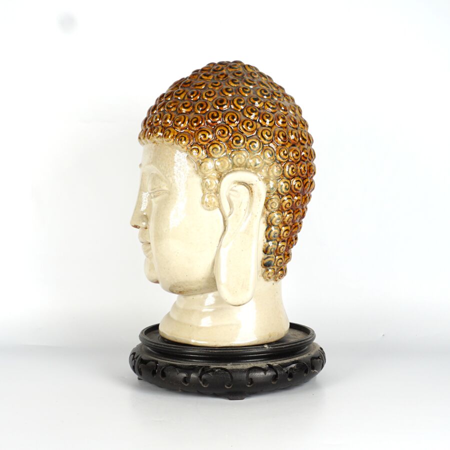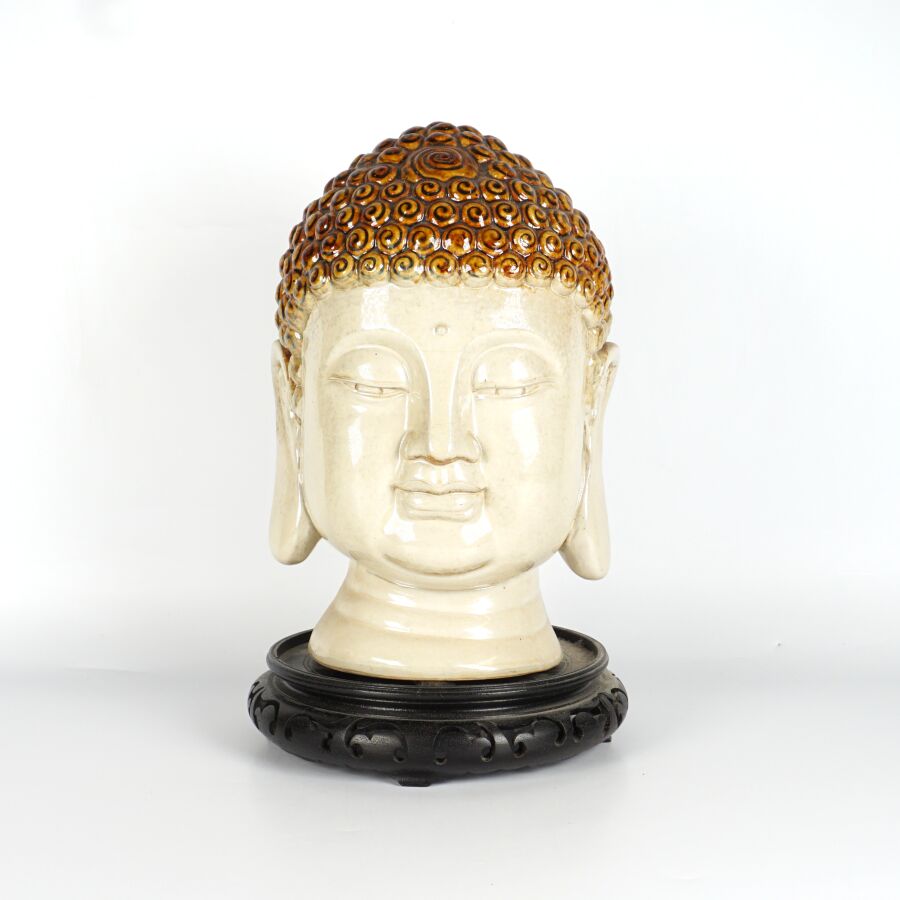 Tête de Bouddha en céramique émaillée à l'imitation du grès, travail décoratif moderne dans le goût de la Chine, avec son socle en bois, H. Totale : 32 cm.