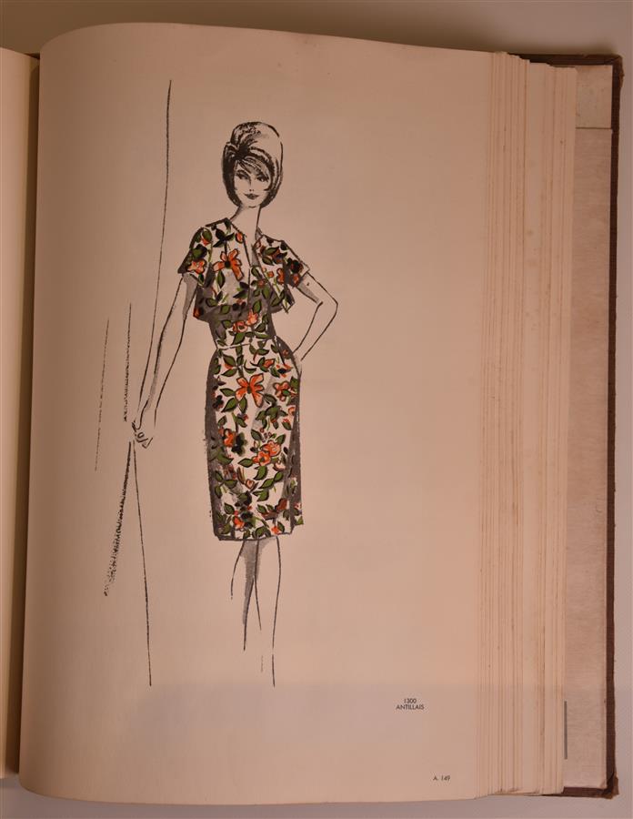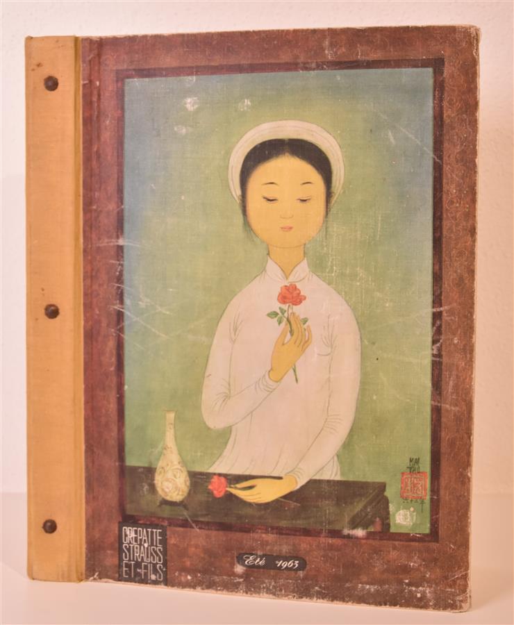 [TEXTILE] - Catalogue d'échantillons de la maison Parisienne Crepatte Strauss et fils pour l'été 1963 - 1 fort volume In-Folio reliure cloutée (légèrement frottée) toile ornée d'1 illustration couleurs de Maï-Thu intitulée Femme à la rose au 1er plat - Bouts d'échantillons de textiles contrecollés (dentelles, lainages, tergal, tweed, nylon, satin, etc. ), dessins couleurs hors-texte et photos en noir - Dos toile jaune - Bon état.