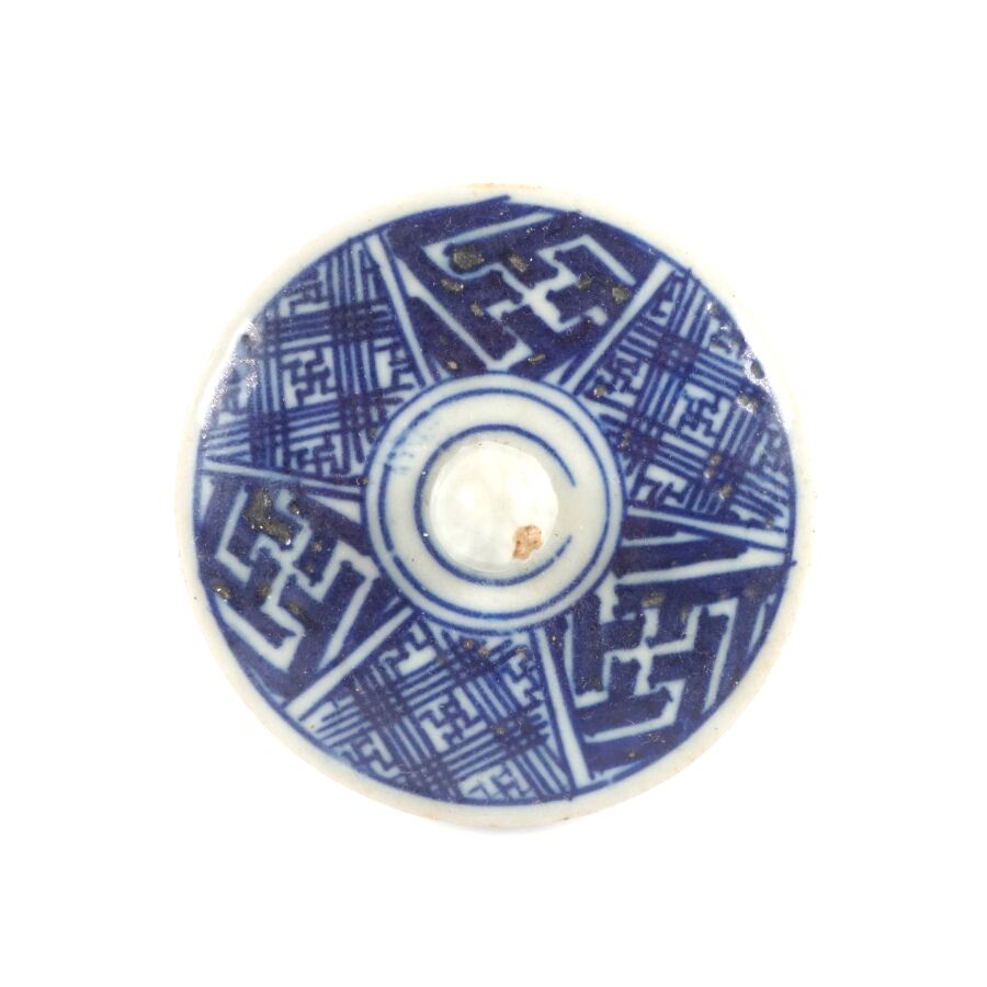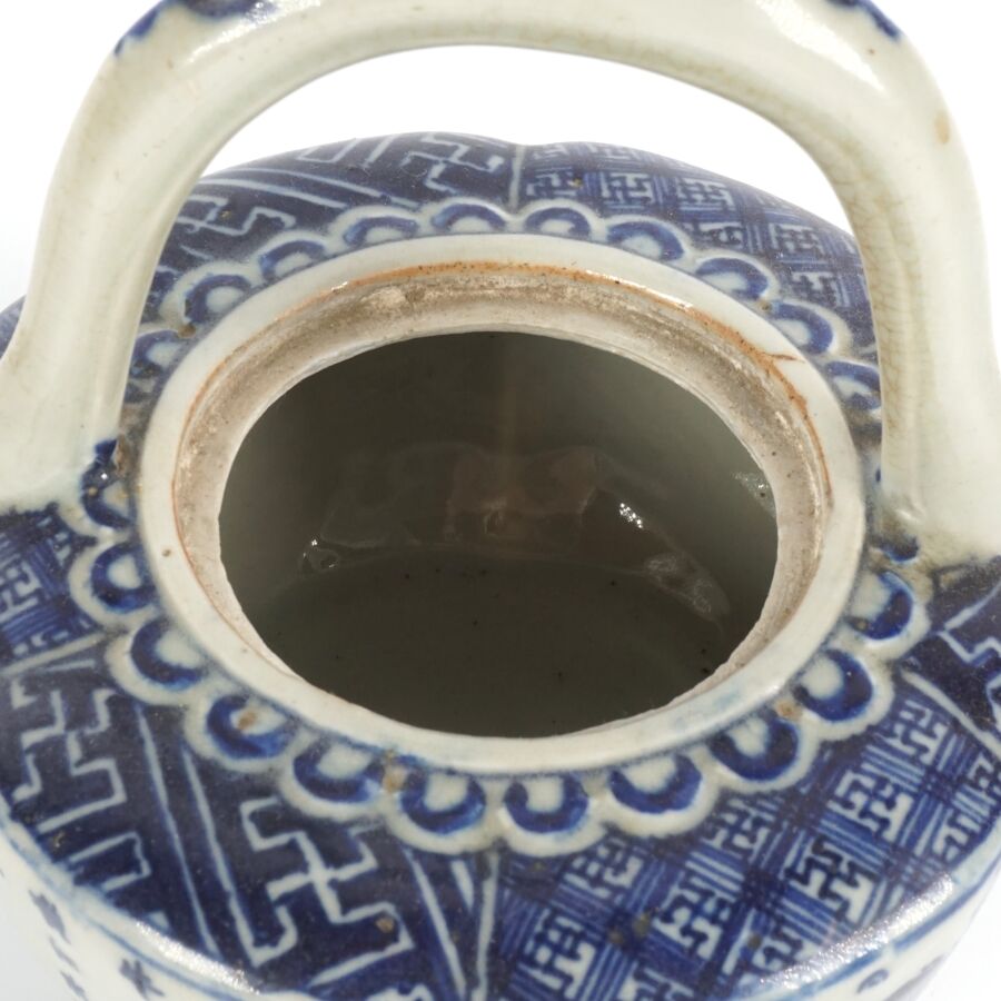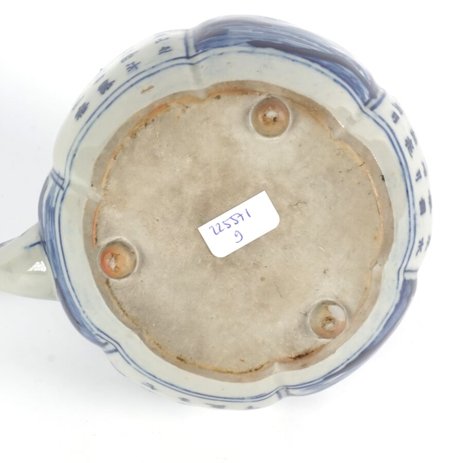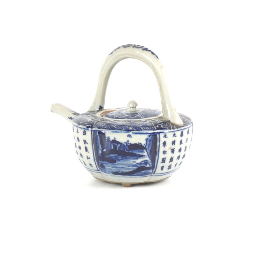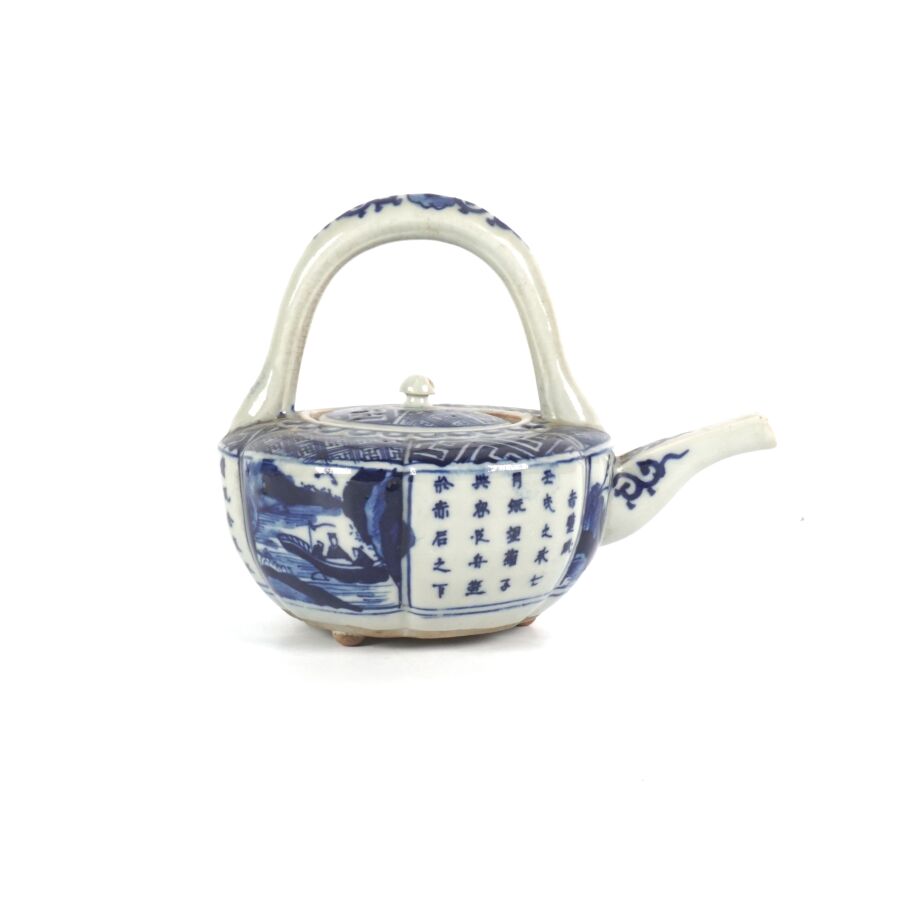 Théière en porcelaine bleu blanc, à décor imprimé de calligraphies et scènes paysagées, Chine, 20ème siècle, H. 14.5 cm.