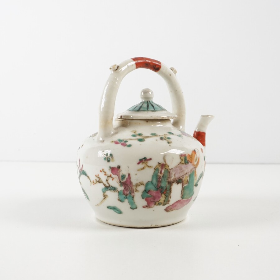 Théière en porcelaine en émaux de la famille rose à décor de scènes de personnages sur le pourtour, période Tongzhe, circa 1870, H. 11 cm (sauts d'émail, légers éclats).