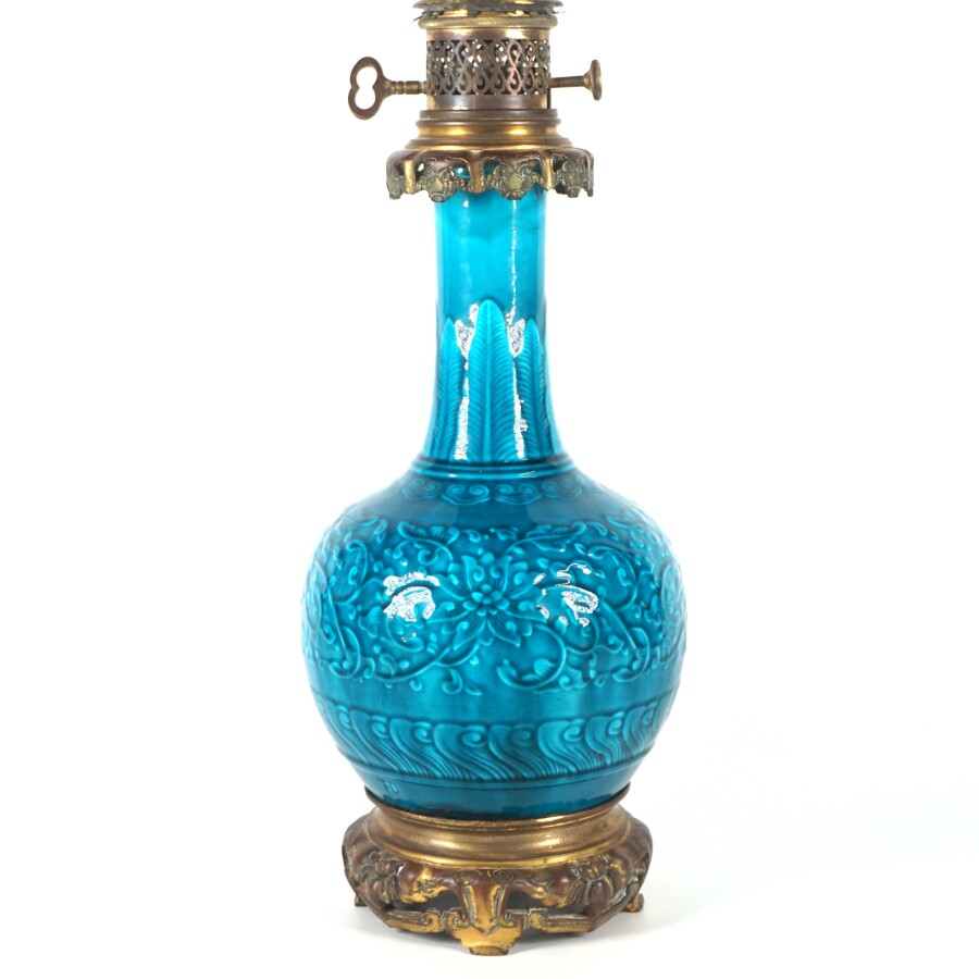 Théodore DECK (1823-1891) : Lampe à poser, corps pansu et haut col droit, faïence émaillée turquoise à décor de rinceaux fleuris, palmettes et feuillages, monogrammé THD en bas, monture ajourée orientaliste en bronze doré, H. totale (hors tulipe) : 47 cm, H. Vase : 38 cm.