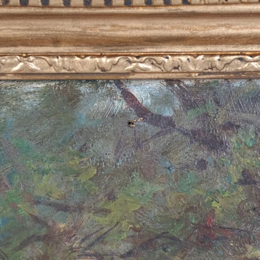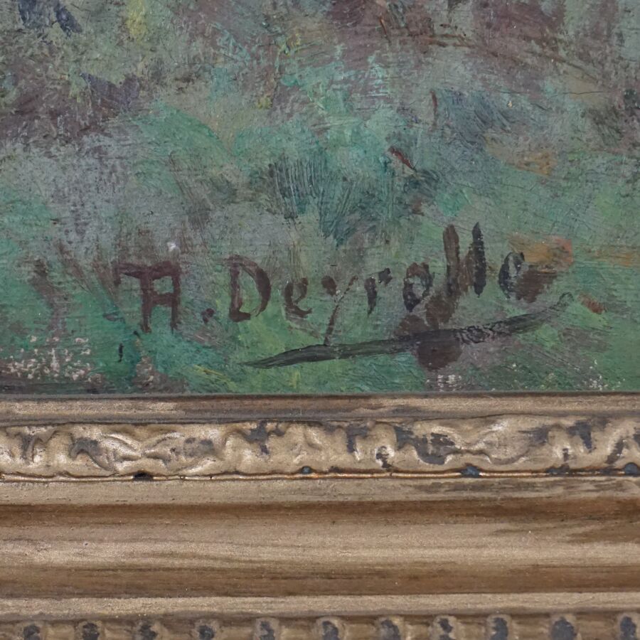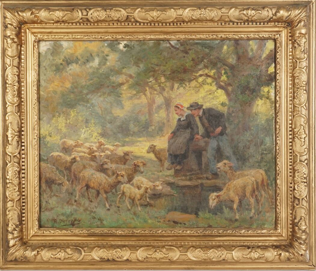 Théophile Louis DEYROLLE (1844-1923), "Le troupeau de brebis", huile sur toile signée en bas à gauche, 32 x 42 cm (trou de punaise en haut au centre).
