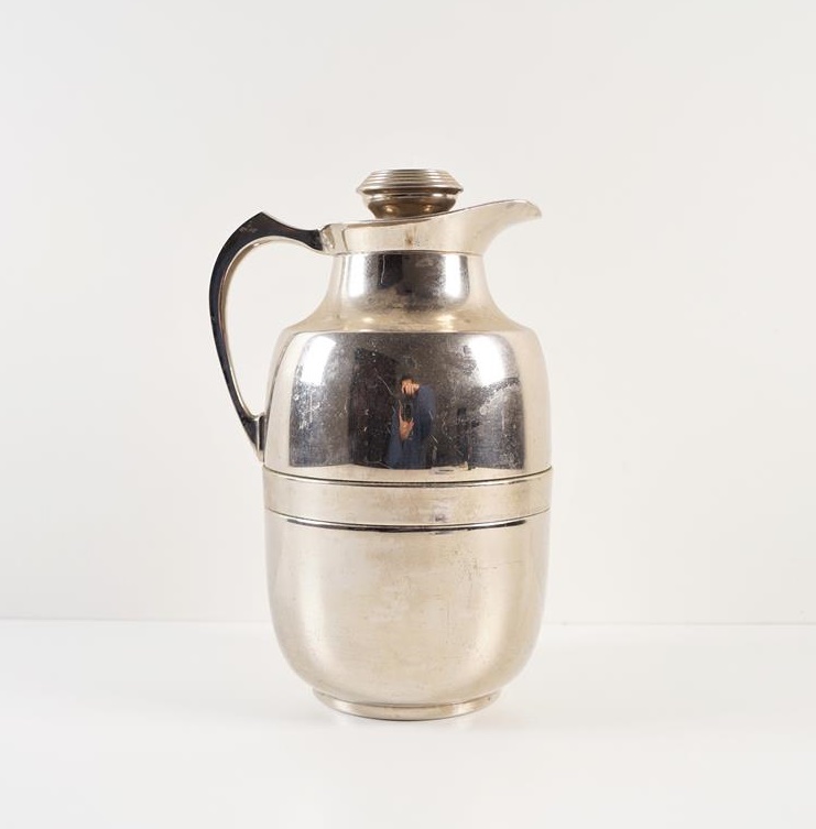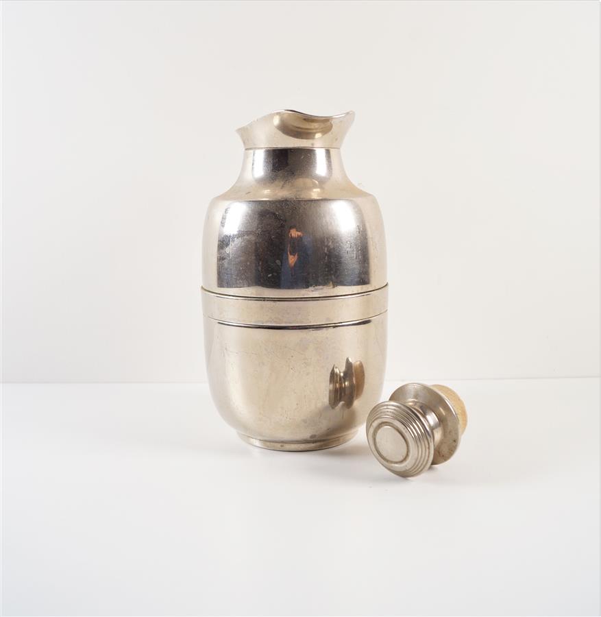 THERMID : Verseuse en métal argenté de forme balustre avec son bouchon, marqué dessous, H. 25 cm.