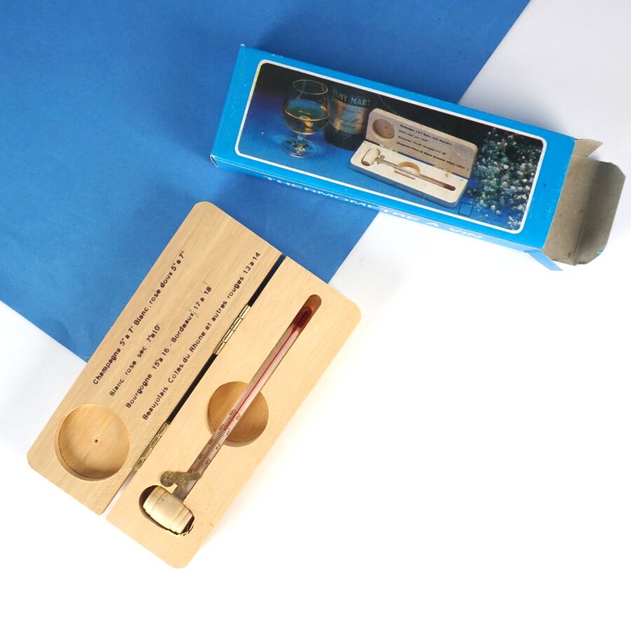 Thermomètre à vin en verre, présenté dans son étui en bois et sa surboîte, L. 12.8 cm.