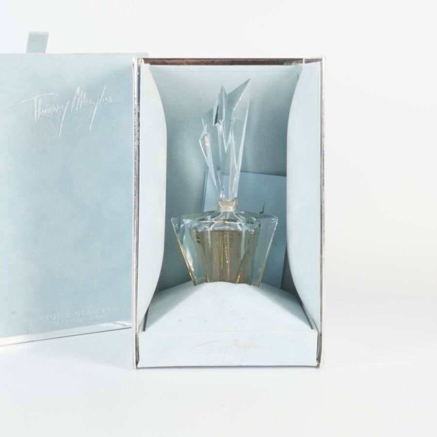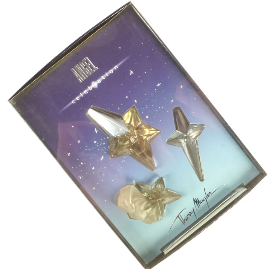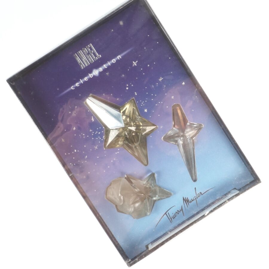 THIERRY MUGLER : Ensemble de flacons comprenant (2) coffrets "Angle celebration, apparitions micro cosmiques" contenant Once upon a star (5 ml), A star is born (5 ml) et pendentif fatal star ; "Angel", flacon dans son emboîtage d'origine (20 ml) ; (1) coffret "Angel, jardin d'étoiles", contenant trois eau de parfum Violette Angel, Pivoine Angel et Lys Angel (3 x 5ml) (sous blister) ; "Innocent", eau de parfum, vaporisateur de sac, deux recharges et entonnoir (3 x 10 ml) et "Angel celebration, fatal star", eau de parfum, vaporisateur, dans sa boîte d'origine (10 ml).