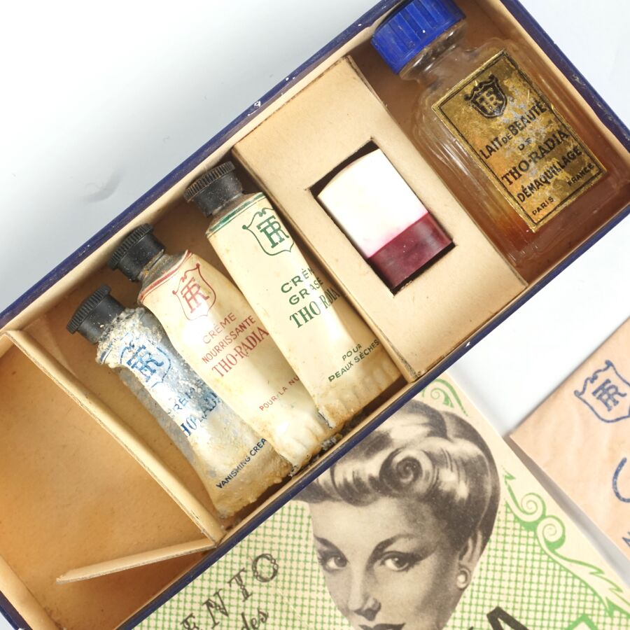 THO-RADIA : Coffret d'essai des produits, boîte contenant 7 sachets "poudre de luxe" (2 x Mauresque, Andalou, Naturelle, Pêche, Tahiti, Ocre rose), un flacon "lait de beauté, démaquillage et trois tubes de crème, avec notices (en l'état, usures, traces).