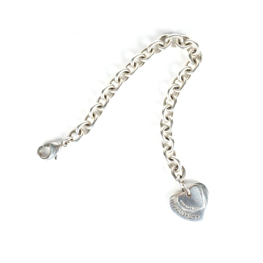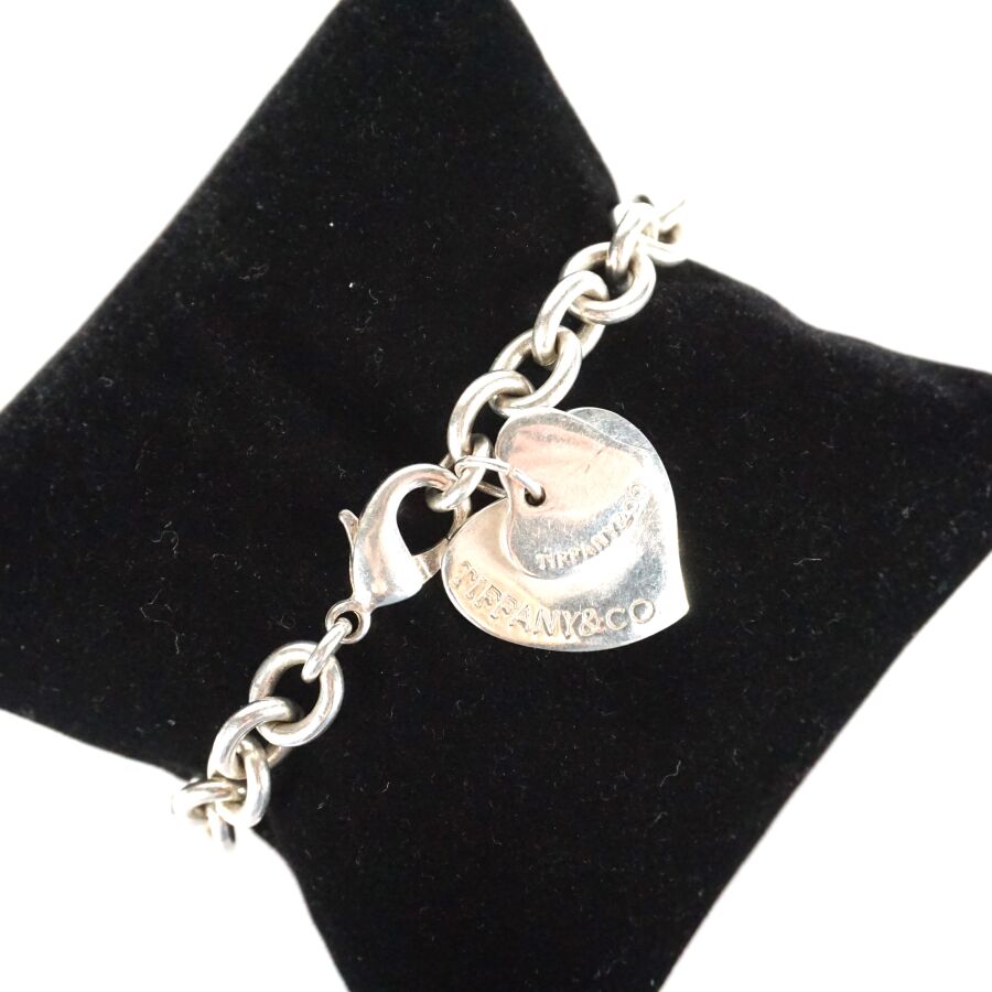 TIFFANY & CO : Bracelet en argent (925/oo), maille forçat, serti de deux breloques "coeur" signées, fermoir mousqueton, L. 20.5 cm. Larg. 9 mm. Poids brut : 33.7 g environ.