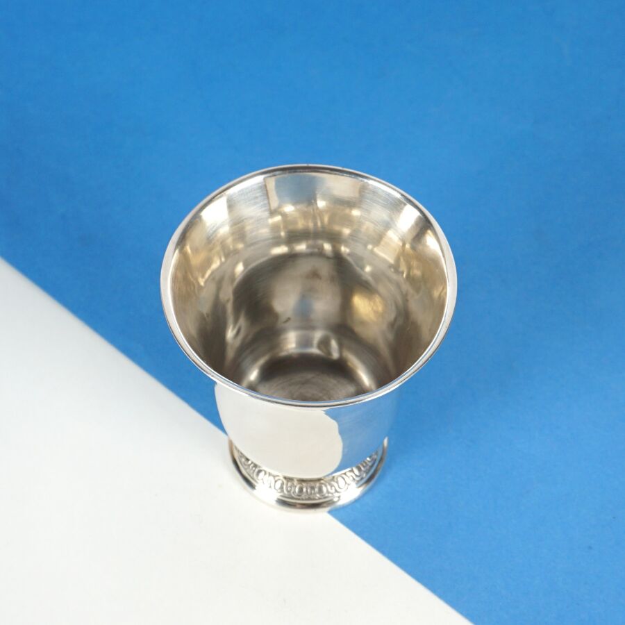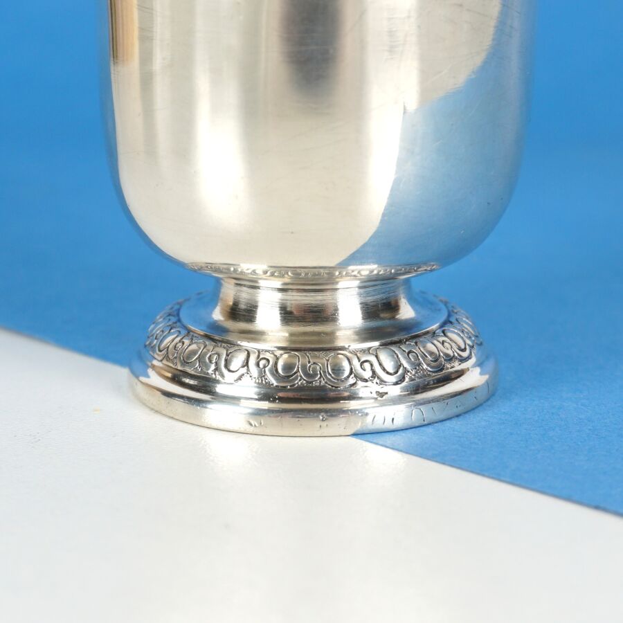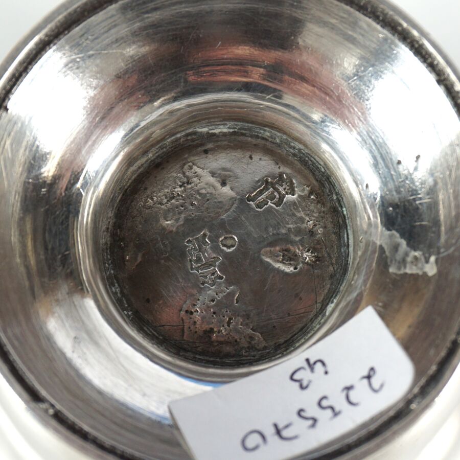 Timbale sur piédouche en argent, poinçon au F couronné probablement Paris (1722/1746), et P couronné, la base à motif d'une frise d'entrelacs, H. 9 cm. Poids brut : 123 g environ.