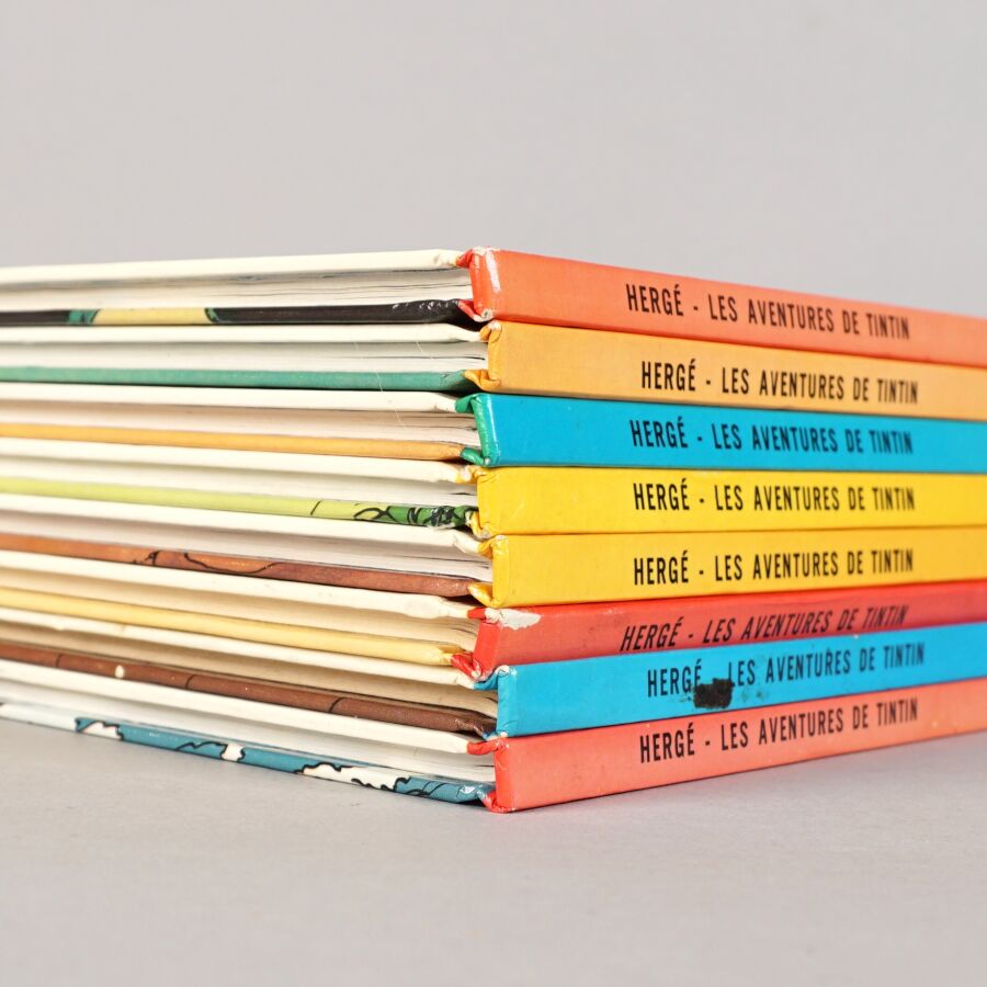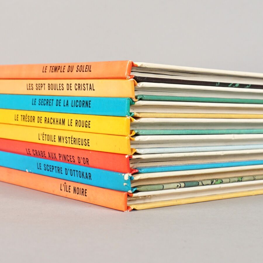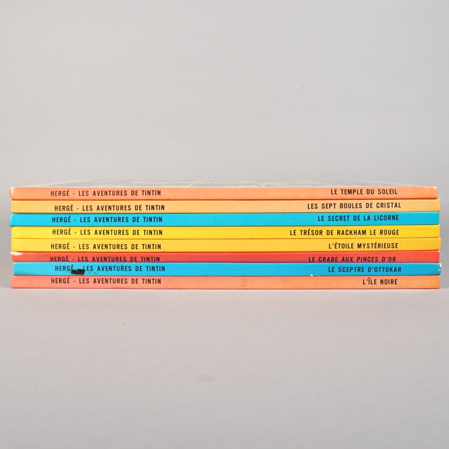 TINTIN, éd. CASTERMAN : Ensemble de 8 albums comprenant "Le temple du soleil", "Les sept boules de cristal", "Le secret de la Licorne", "Le trésor de Rackham le Rouge", "L'étoile mystérieuse", "Le crabe aux pinces d'or", "Le sceptre d'Ottokar" et "L'île noire".