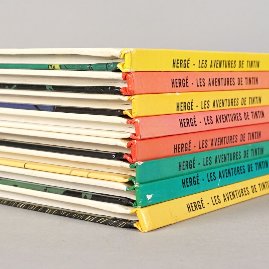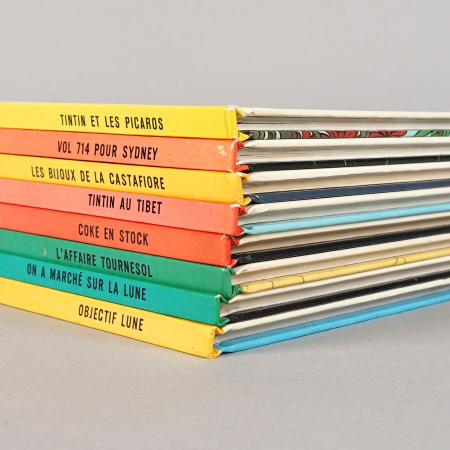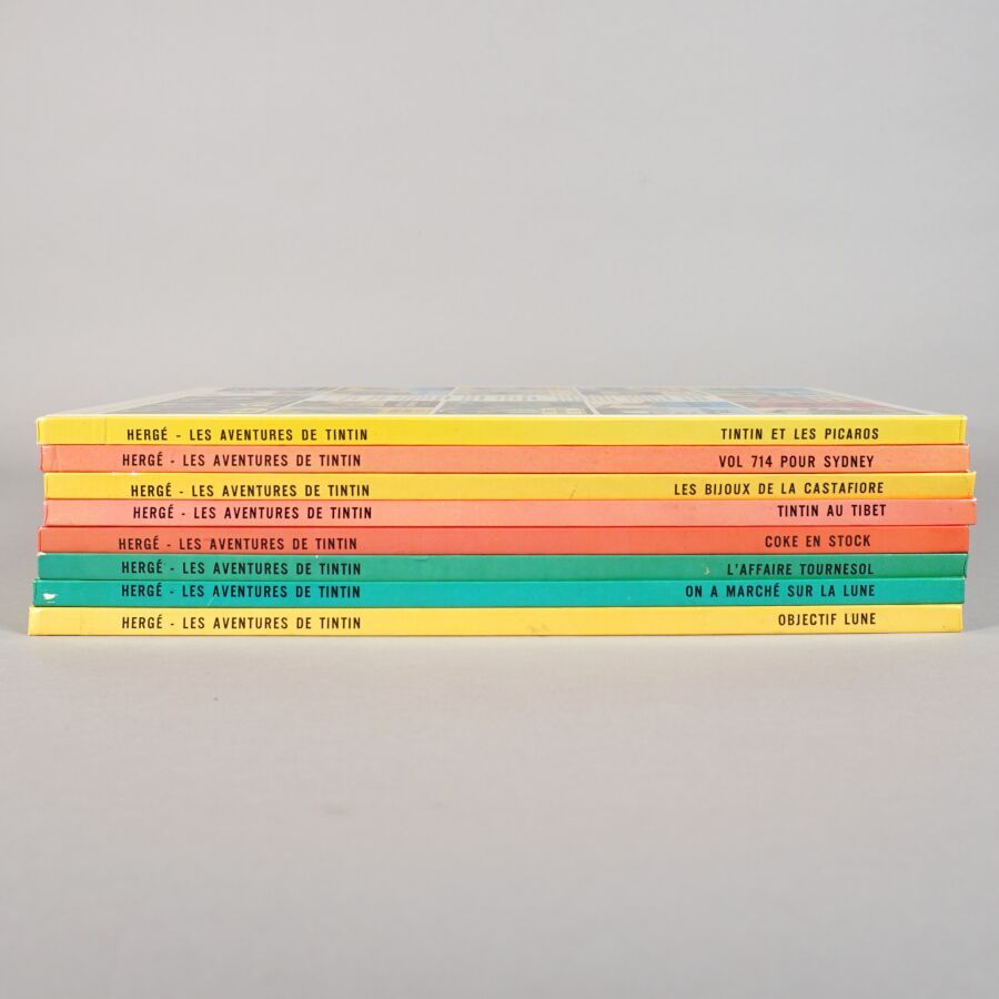 TINTIN, éd. CASTERMAN : Ensemble de 8 albums comprenant "Tintin et les Picaros", "Vol 714 pour Sydney", "Les bijoux de la Castafiore", "Tintin au Tibet", "Coke en stock", "L'affaire Tournesol", "On a marché sur la lune" et "Objectif Lune".
