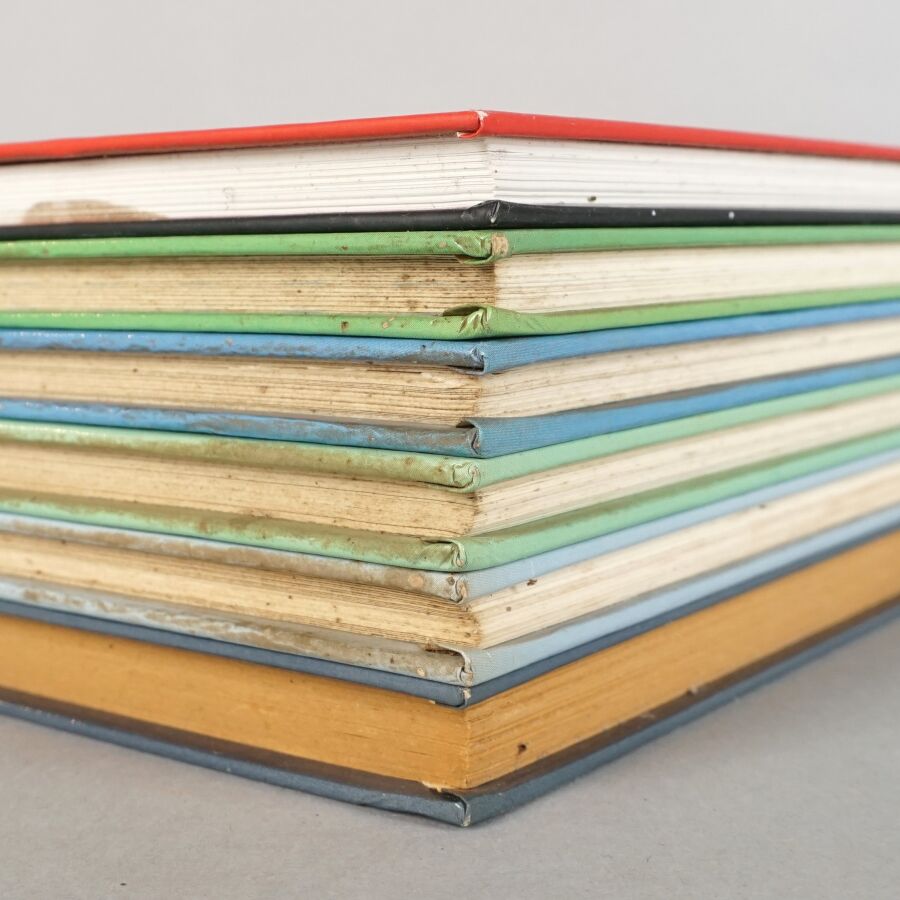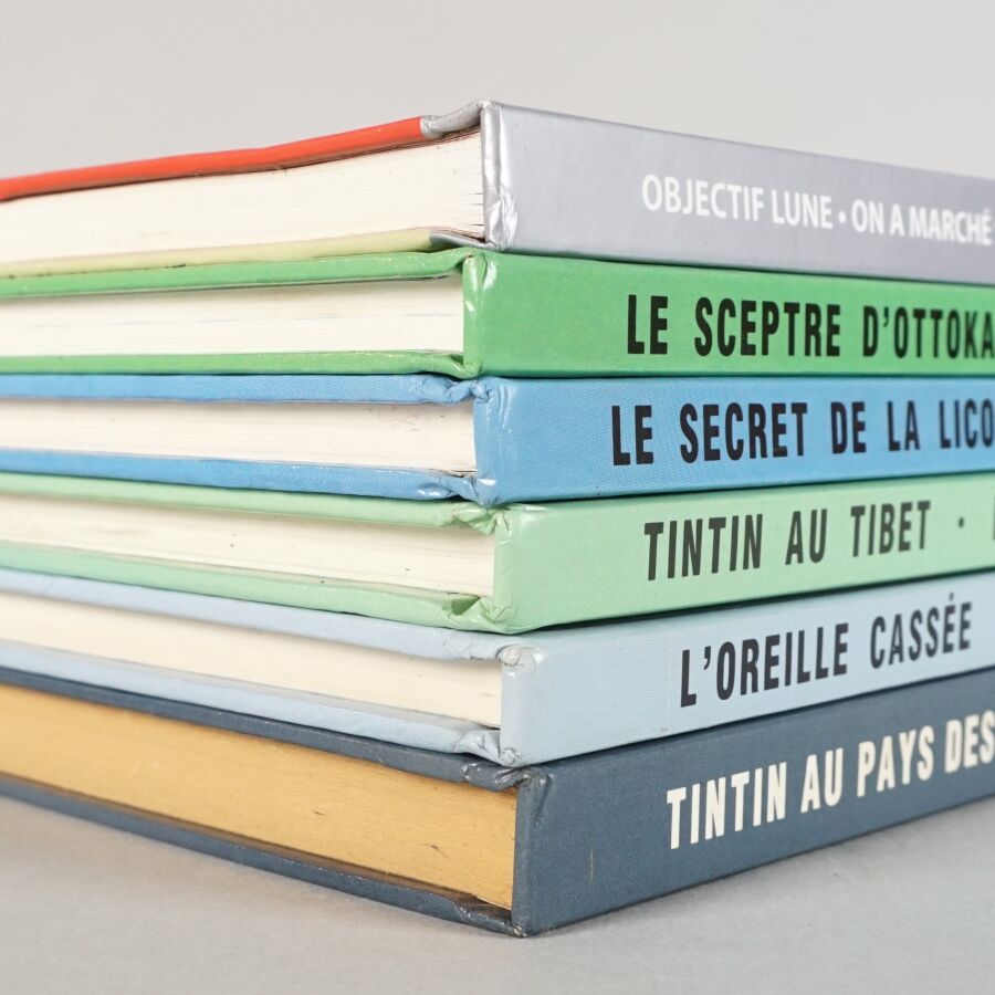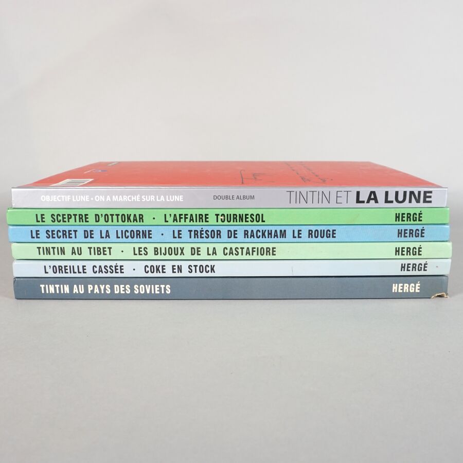 - 5 albums doubles comprenant Objectif Lune / On a marché sur le Lune, Le sceptre d'Ottokar / L'affaire Tournesol, Le secret de Licorne / Le trésor Rackham Le Rouge, Tintin au Tibet / Les bijoux de la castafiore, L'oreille cassée / Coke en stock,