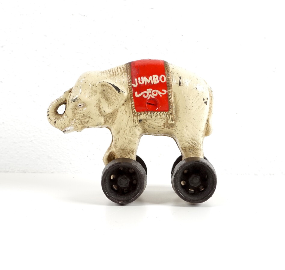Tirelire "Jumbo" en fonte laquée beige et rouge, sur roulettes, H. 9.5 cm (usures).