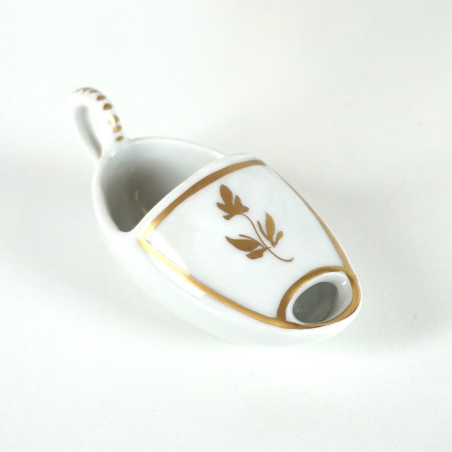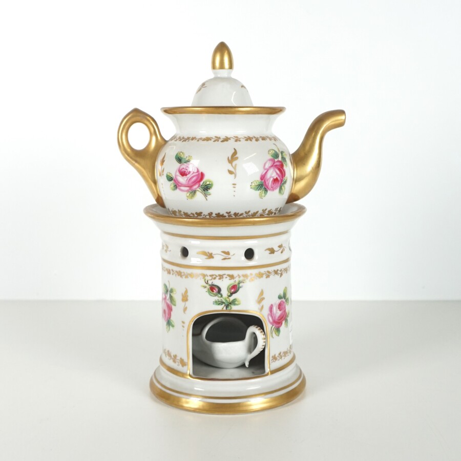 Tisanière, porcelaine émaillée polychrome et rehauts d'or, à décor de fleurs et frises feuillagées, H. 25 cm.