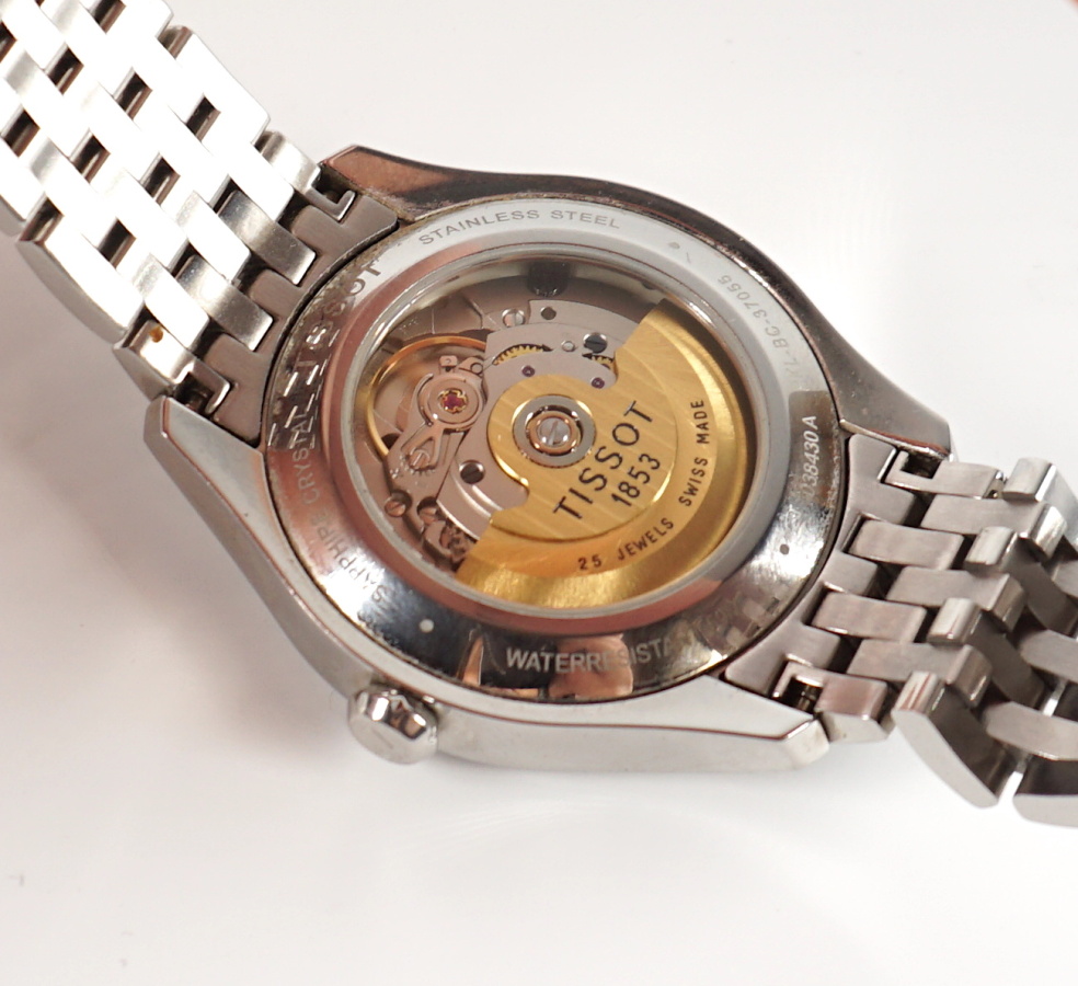 TISSOT : Montre d'homme en acier, ref. T038430A -RKL-BC-37055, cadran fond bronze guilloché, chiffres arabes, jour à 12h, dateur à 6h, D. 4 cm, mouvement mécanique à remontage automatique, bracelet souple maille bâtonnets, boucle papillon, L. 19 cm.