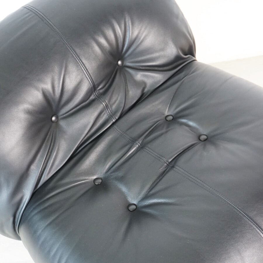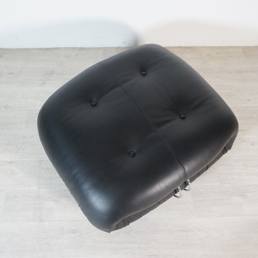 Tobia SCARPA (1935) : Chauffeuse et son ottoman, modèle " Soriana ", cuir noir, cerclage métallique chromé, édition Cassina, circa 1971, étiquette d'édition sous l'ottoman, avec roulettes, H. Fauteuil : 67 cm. P. 89 cm x L. 86 cm. H. Ottoman : 40 cm x 74 x 85 cm (petites usures d'usage, bel état).
