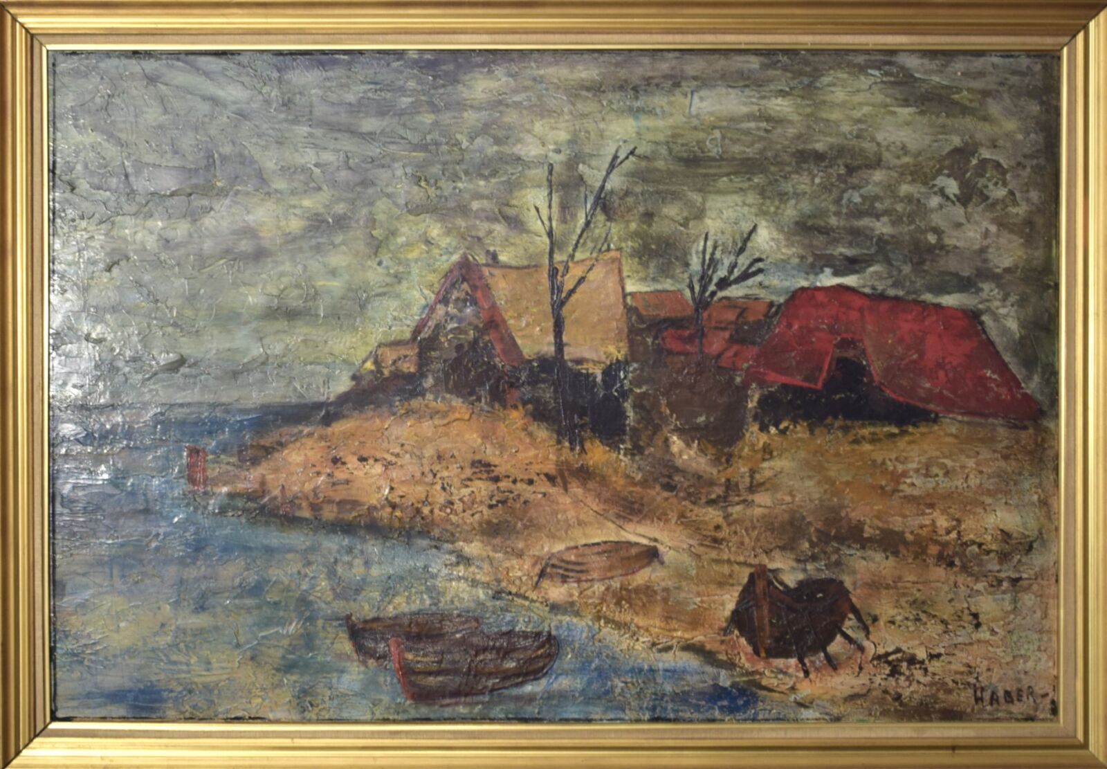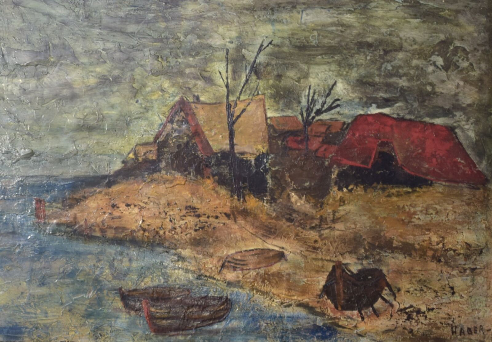 Tobiasz HABER (1885-1943), "La Ferme au toit rouge" 1962, huile sur panneau, signée en bas à droite, contresignée et datée au dos, 70 x 104 cm.