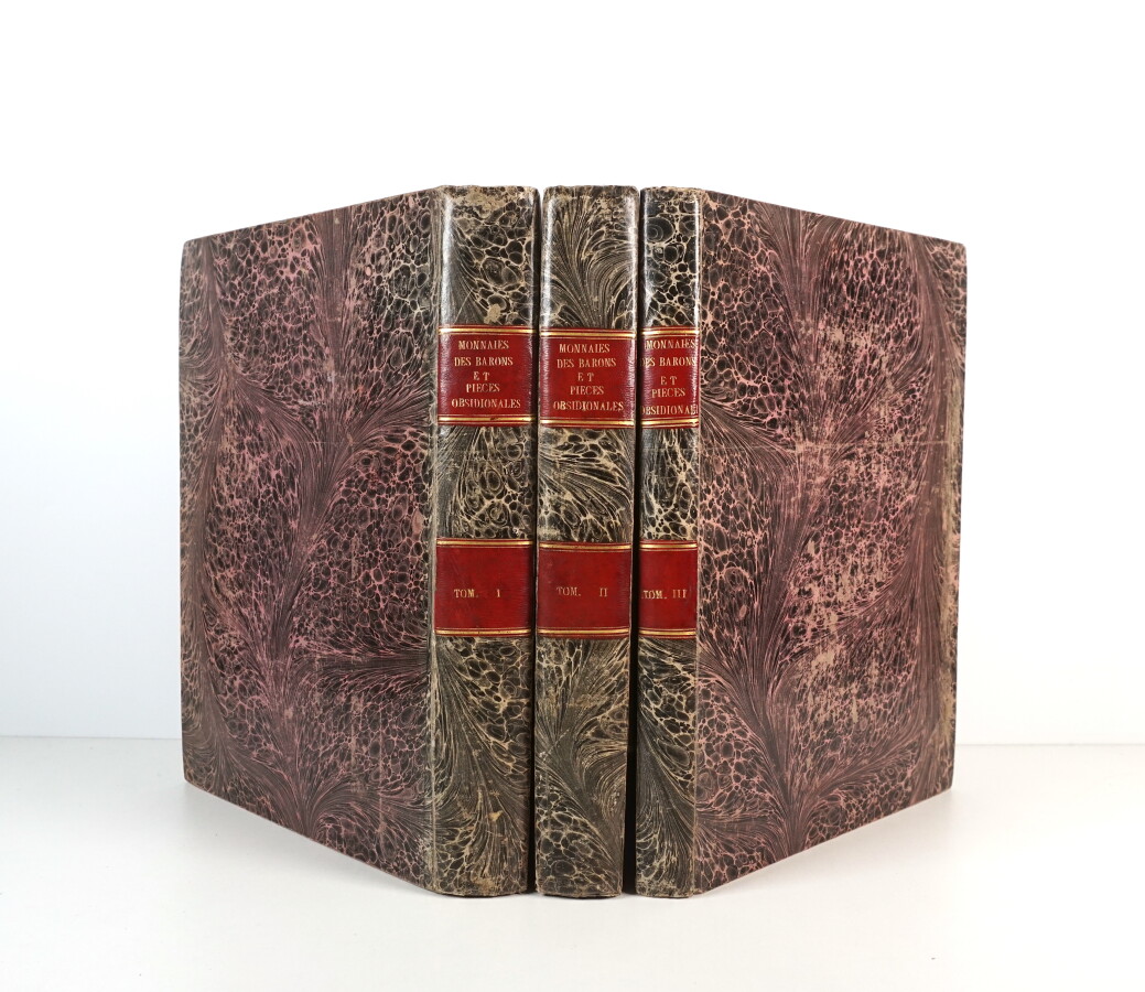 TOBIÉSEN-DUBY (Pierre-Ancher) - Ensemble de 3 volumes : Traité des monnoies des Barons, ou représentation et explication de toutes les monnoies d'or [] - Paris ; Imprimerie Royale, 1790 - Recueil général des Pièces obsidionales et de nécessité, gravées dans l'ordre chronologique des évènemens [] - Paris ; Chez la Veuve de l'auteur, Debure, 1786 - 3 volumes In-folio - Pâle auréole en marge supérieure de quelques feuillets du tome II, de rares et pâles rousseurs éparses - Portrait frontispice de l'auteur manquant - Le Traité des monnoies des Barons est illustré de 120 planches gravées de monnaies, dont 10 en supplément, le Recueil des Pièces obsidionales comprend 31 planches, dont 4 pour les Récréations numismatiques qui terminent l'ouvrage - Reliure 1ère moitié du XIXème siècle cartonnage marbré rose et noir (légers frottements et menus défauts à 1 plat) - Dos lisses avec pièces de titres et de tomaison maroquin cerise ornés de filets dorés -- Exemplaire imprimé sur vergé fort et grand de marges - Bons exemplaires en éditions originales posthumes de ces splendides ouvrages de numismatique formant 2 rares traités complémentaires, 1 grande partie ayant été détruite lors de la tourmente révolutionnaire.
