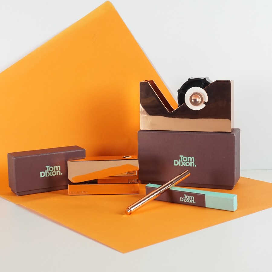 Tom DIXON (1959), Nécessaire de bureau comprenant agrafeuse, dérouleur à scotch et stylo, présentés dans leurs coffrets (état neuf).