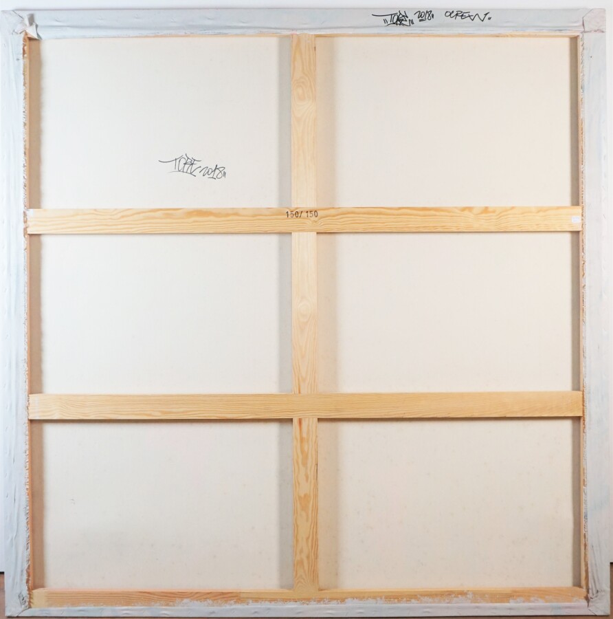 TORE (1972), "Composition orange et violette sur fond blanc" 2018, acrylique et aérosol sur toile, signée et datée au dos, 150 x 150 cm.