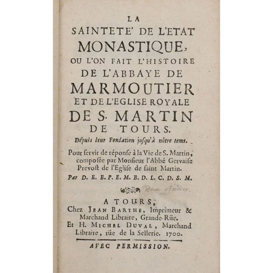 Touraine - [BADIER (Dom Étienne)]. La Sainteté de l'état monastique où l'on fait l'histoire de l'abbaye de Marmoutier et l'église royale de Saint-Martin-de-Tours. Tours, Jean Barthe, H. Michel Duval, 1700. In-12 demi-chagrin rouge à coins, dos à nerfs, titre et date dorés, signé en queue (Barth).