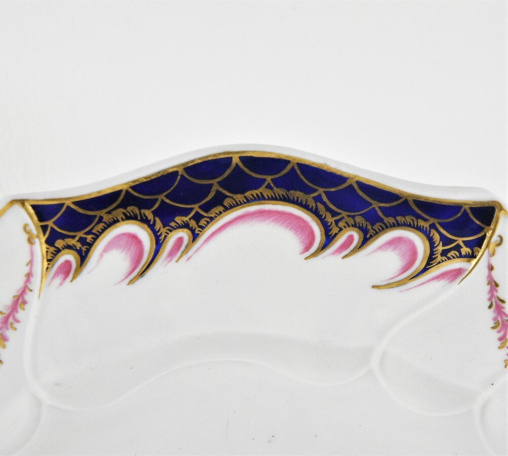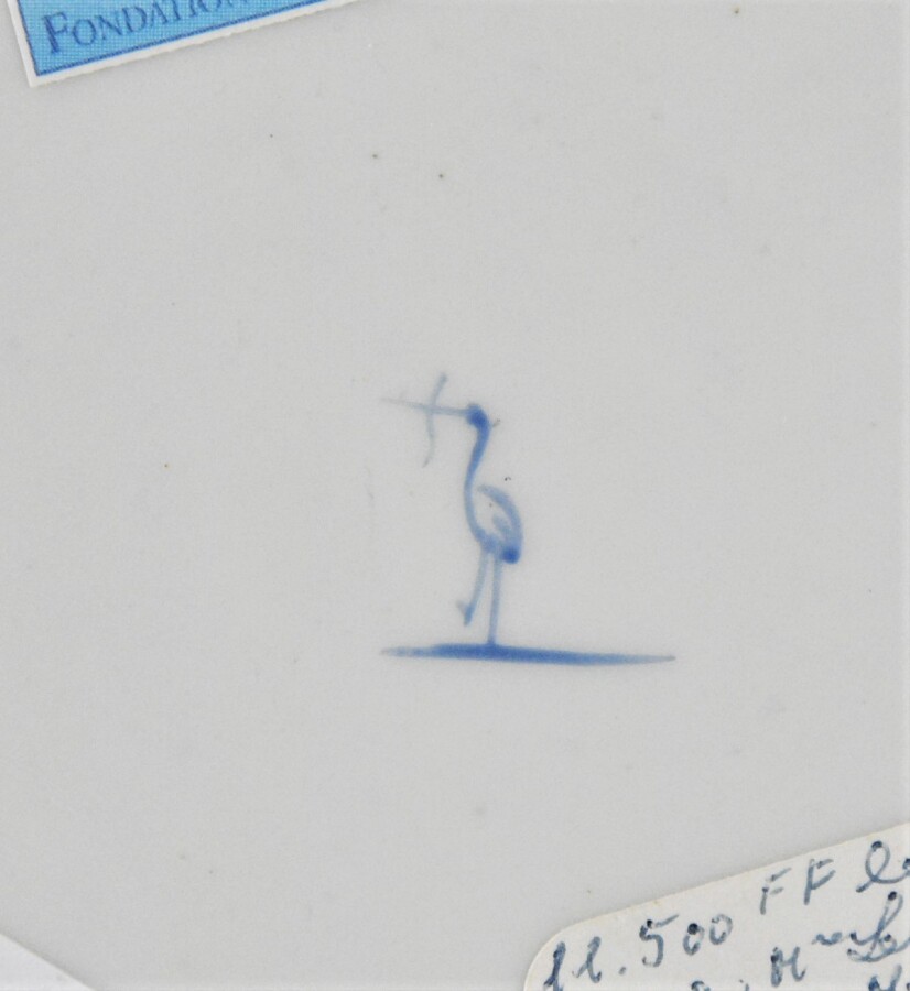 TOURNAI ET LA HAYE : Paire d'assiettes en porcelaine émaillée à côtes torses en léger relief, à décor polychrome au centre de couples d'oiseaux près d'un étang et sur l'aile d'une guirlande de fleurs en camaïeu rose alternée de motif d'écailles à l'or sur fond bleu, marque à la cigogne en bleu au-dessous, 18e siècle, D. 24.5 cm (infimes usures à l'émail).