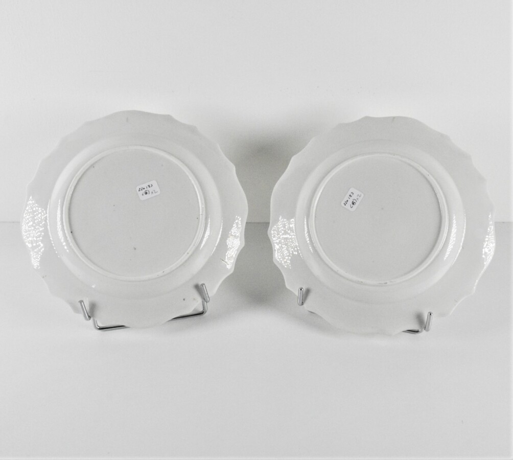 TOURNAI : Paire d'assiettes en porcelaine émaillée à côtes torses, à décor de tiges fleuries et de fleurs émaillées polychromes dans le bassin et sur l'aile, 18e siècle, D. 23.5 cm (infimes usures à l'émail).