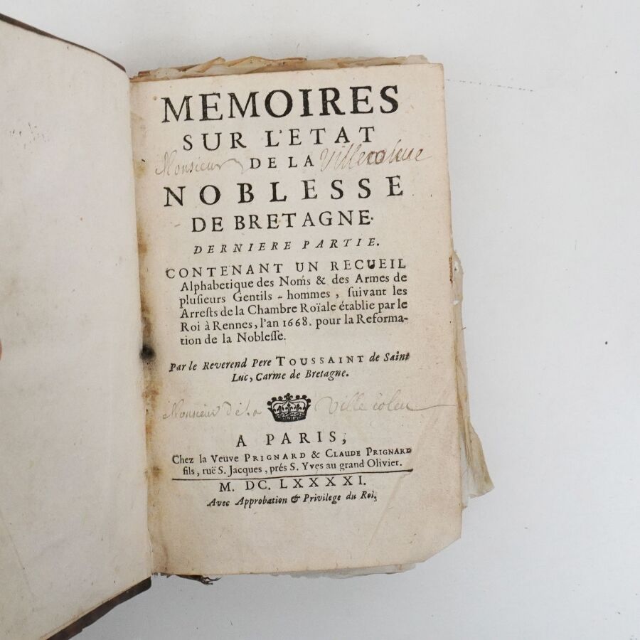 TOUSSAINT (R. P.). Mémoires sur l'état de la noblesse de Bretagne, dernière partie, donnant un recueil alphabétique des noms et des armes de plusieurs gentilshommes suivant les arrêts de la chambre royale établis par le Roi à Rennes l'an 1668 pour la reformation de la noblesse. Paris, Veuve Prignard & Claude Prignard, 1691. In-8 veau brun, dos à nerfs orné (reliure de l'époque). Important manque en coiffe de tête.