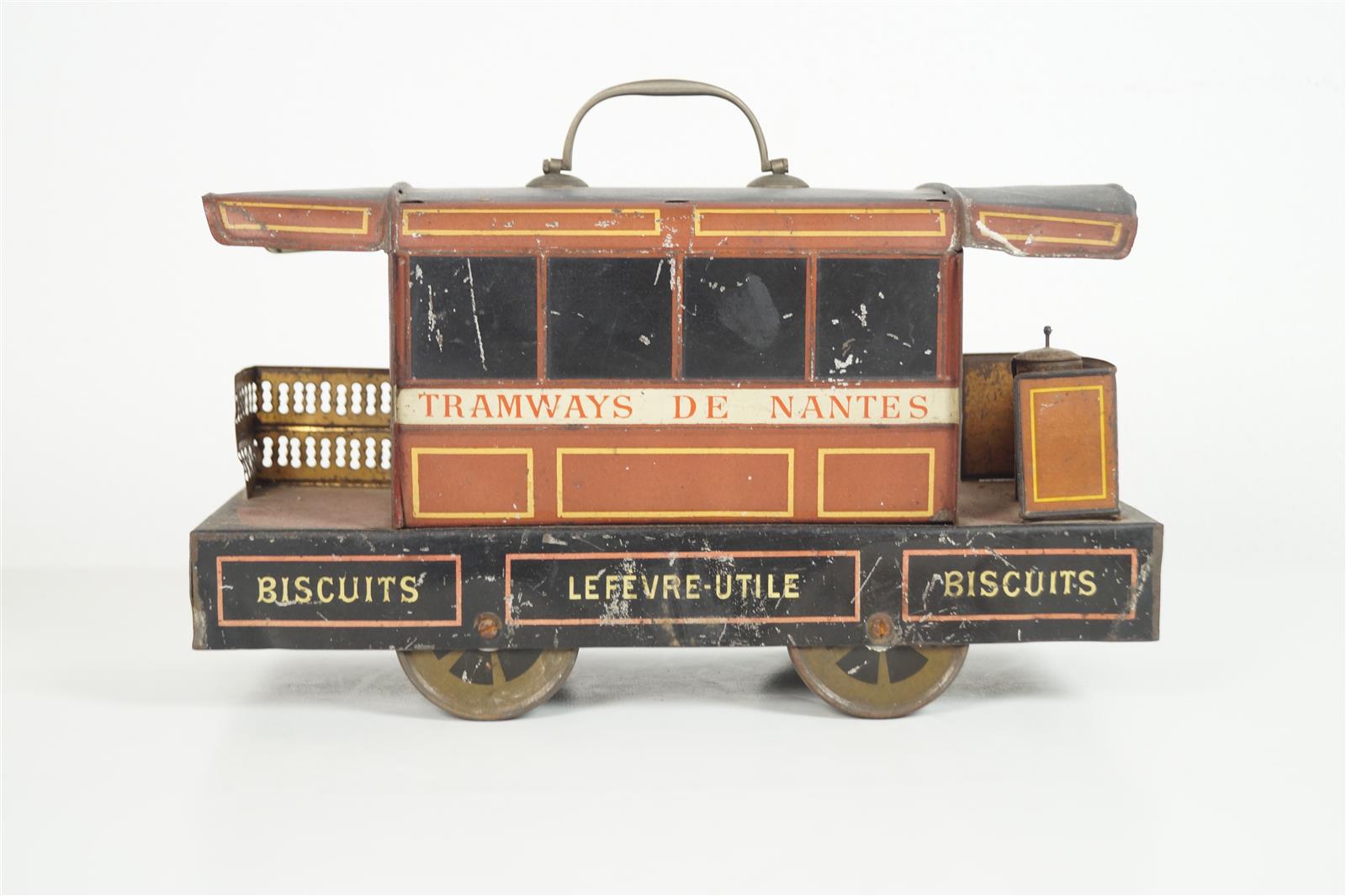 "Tramway de Nantes", boîte à biscuits LU en tôle lithogaphiée, L. 29 cm (incomplet : manquent pancartes, une rambarde et tampons, usures et rayures).
