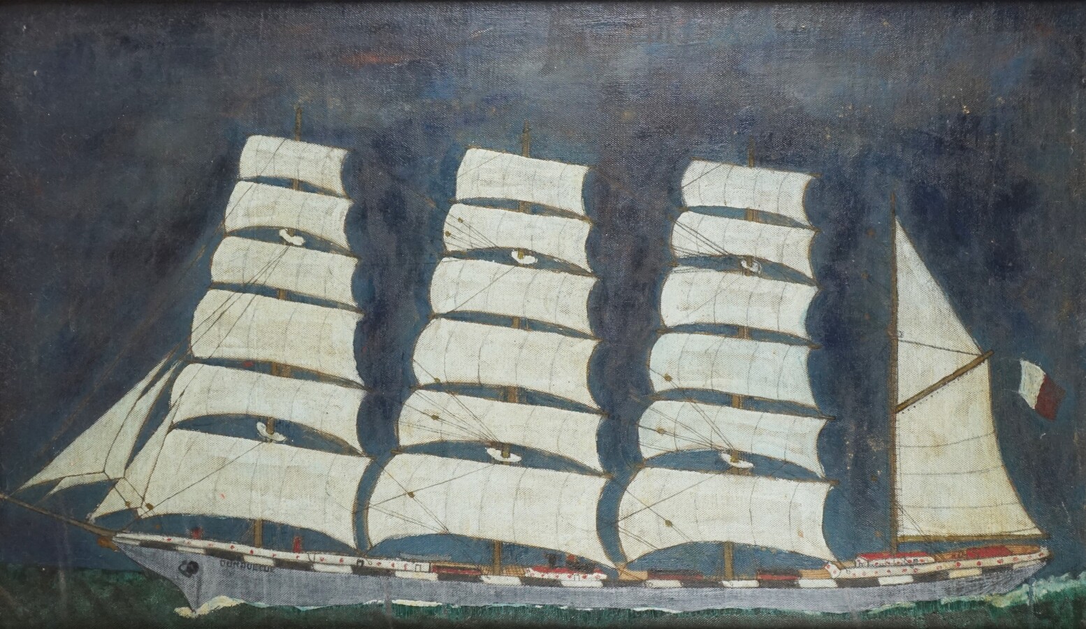 Travail de matelotage, "Quatre mâts barques Le Dunkerque", huile sur toile de sac marouflée sur contreplaquée, 48 x 83 cm (à vue) (usures).