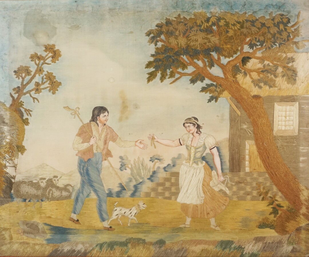 Travail populaire du 19ème siècle, "Couple de paysans", technique mixte à la laine, borderie et aquarelle sur soie, 47 x 57 cm (petits fils tirés, quelques légères taches).