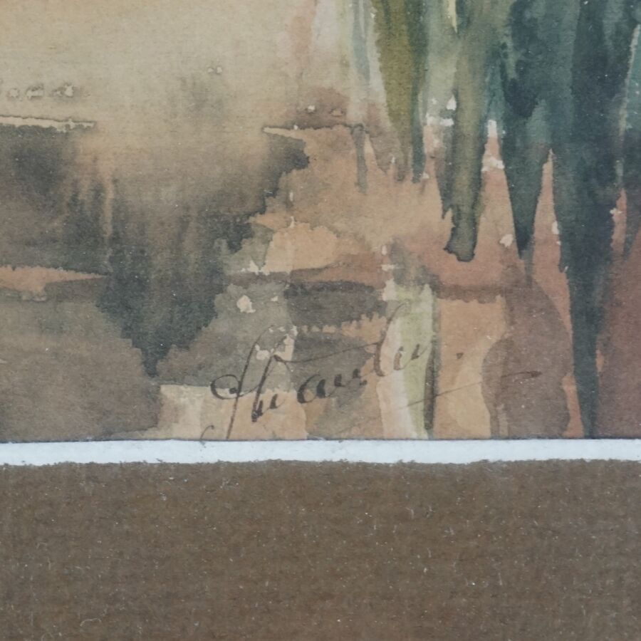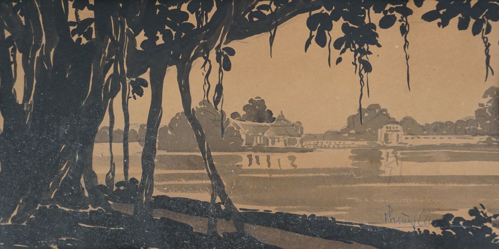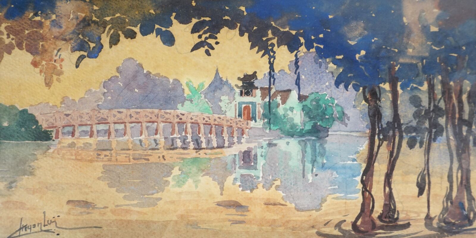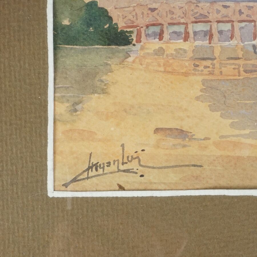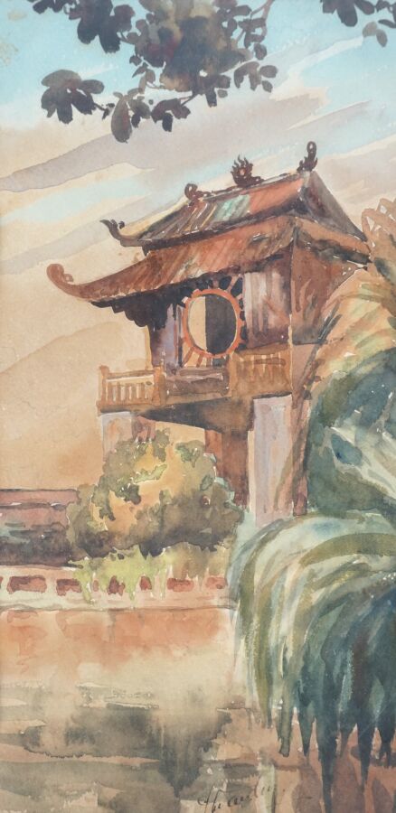 Trois aquarelles représentant des vues de pagodes et de paysages lacustres, signatures difficilement lisibles en bas, Vietnam, circa 1950, Dim. 14.5 x 28.5 cm. 28.5 x 14.5. 28.7 x 14.6 cm (traces).