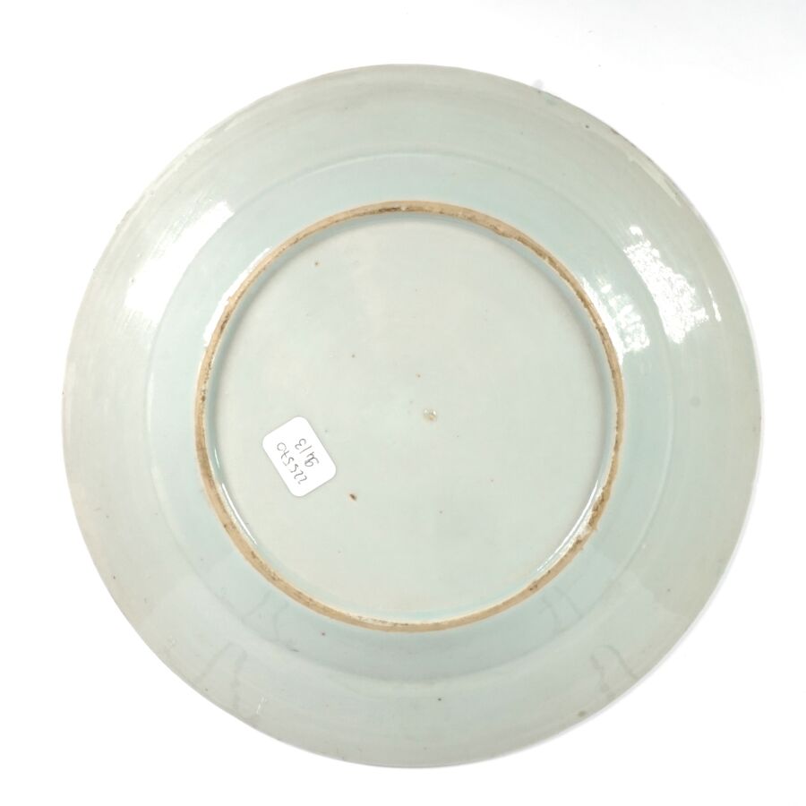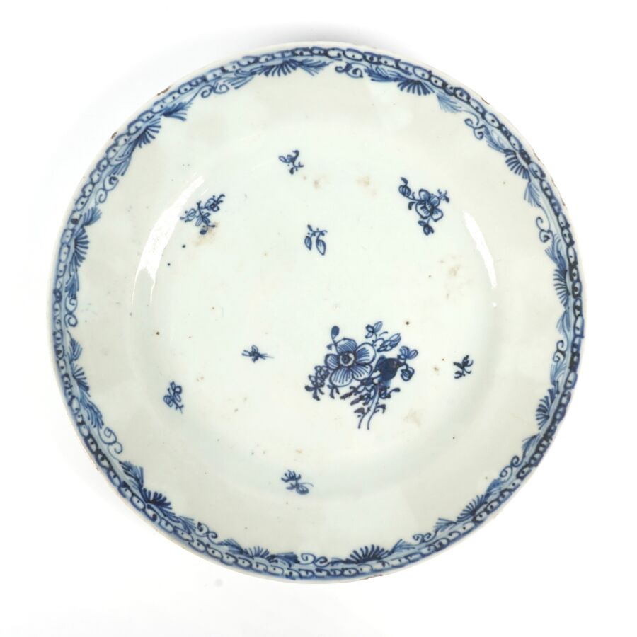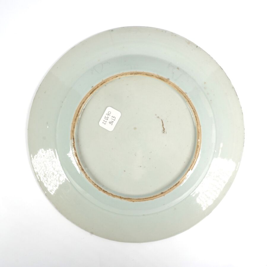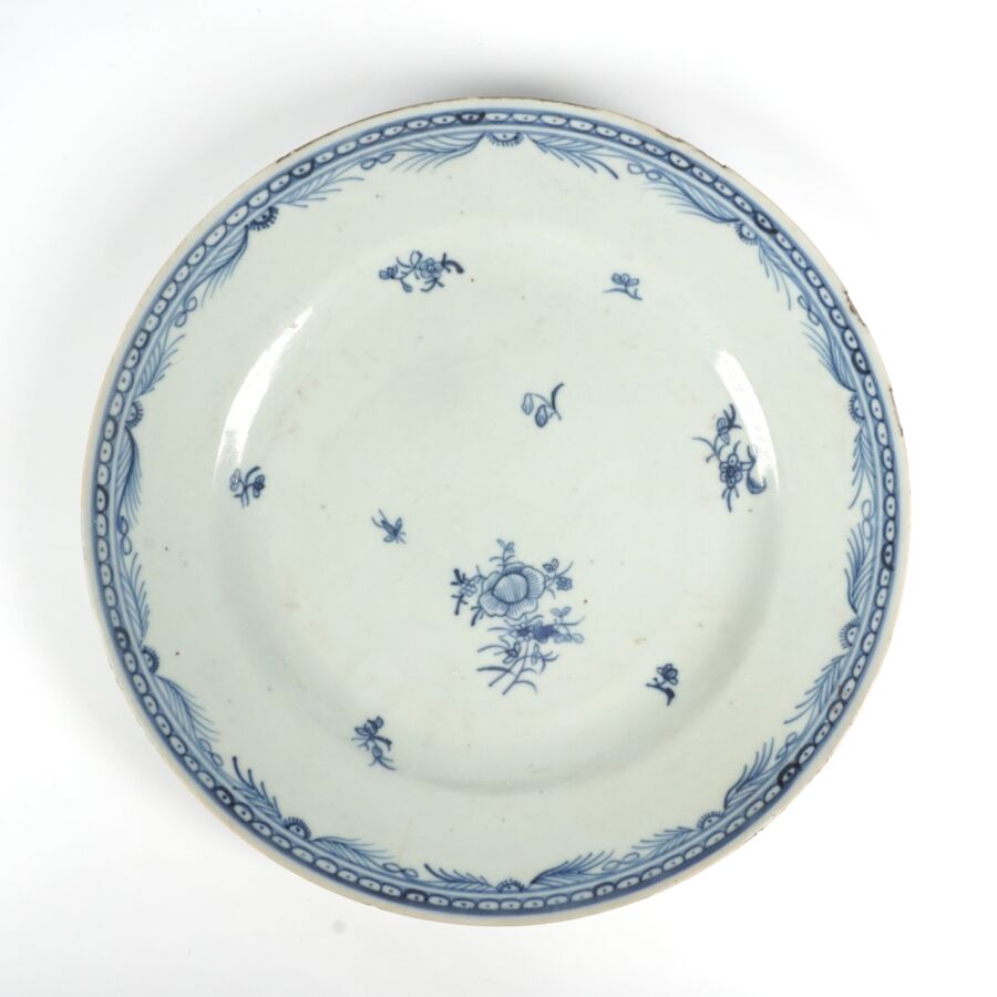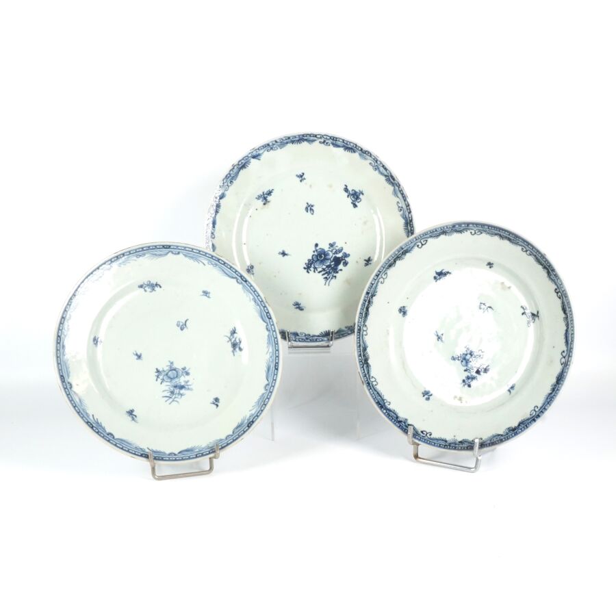 Trois assiettes en porcelaine émaillée en bleu sous couverte de jetées de fleurs, Compagnie des Indes, Chine, 18ème siècle, D. 23.2 cm. 23.6 cm et 23.5 cm (petits éclats en bordure).