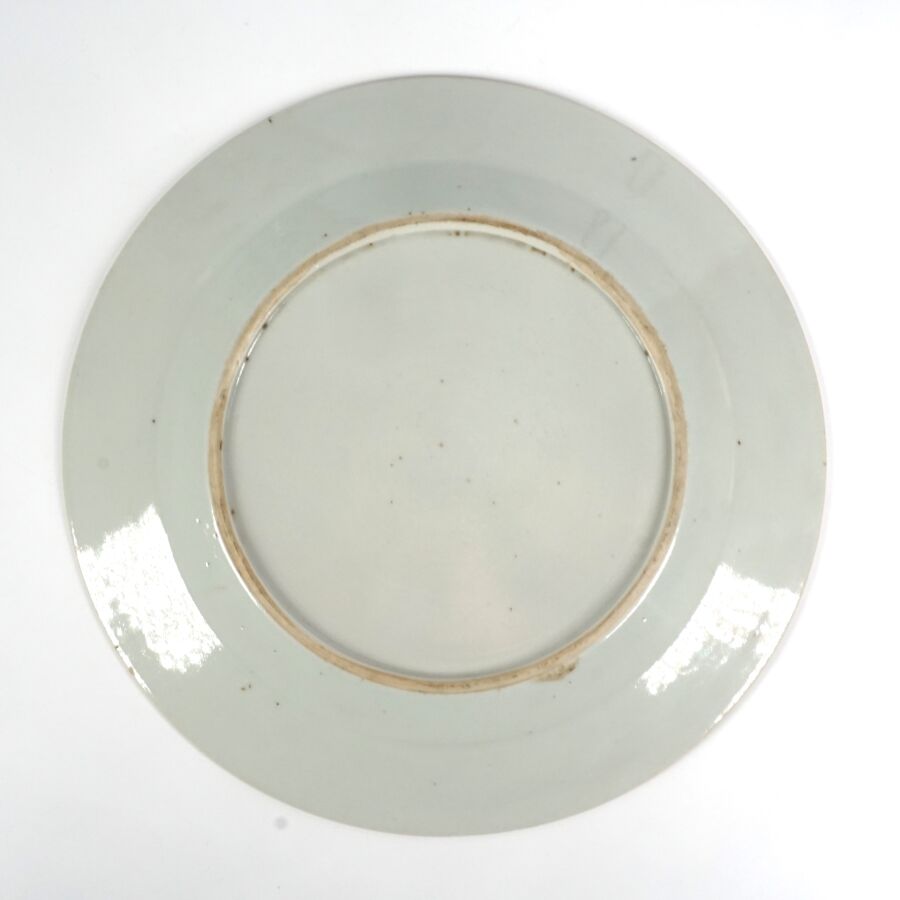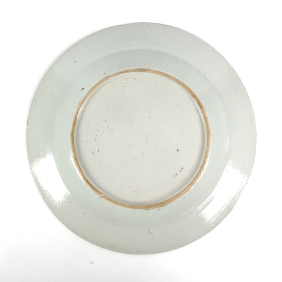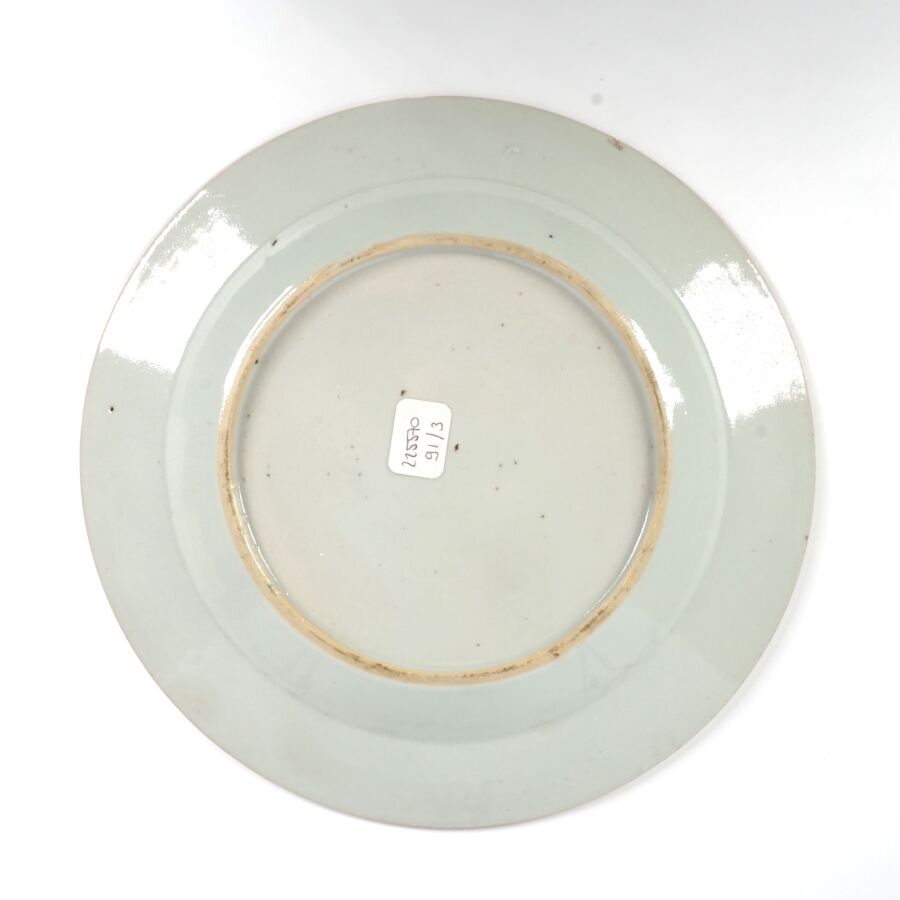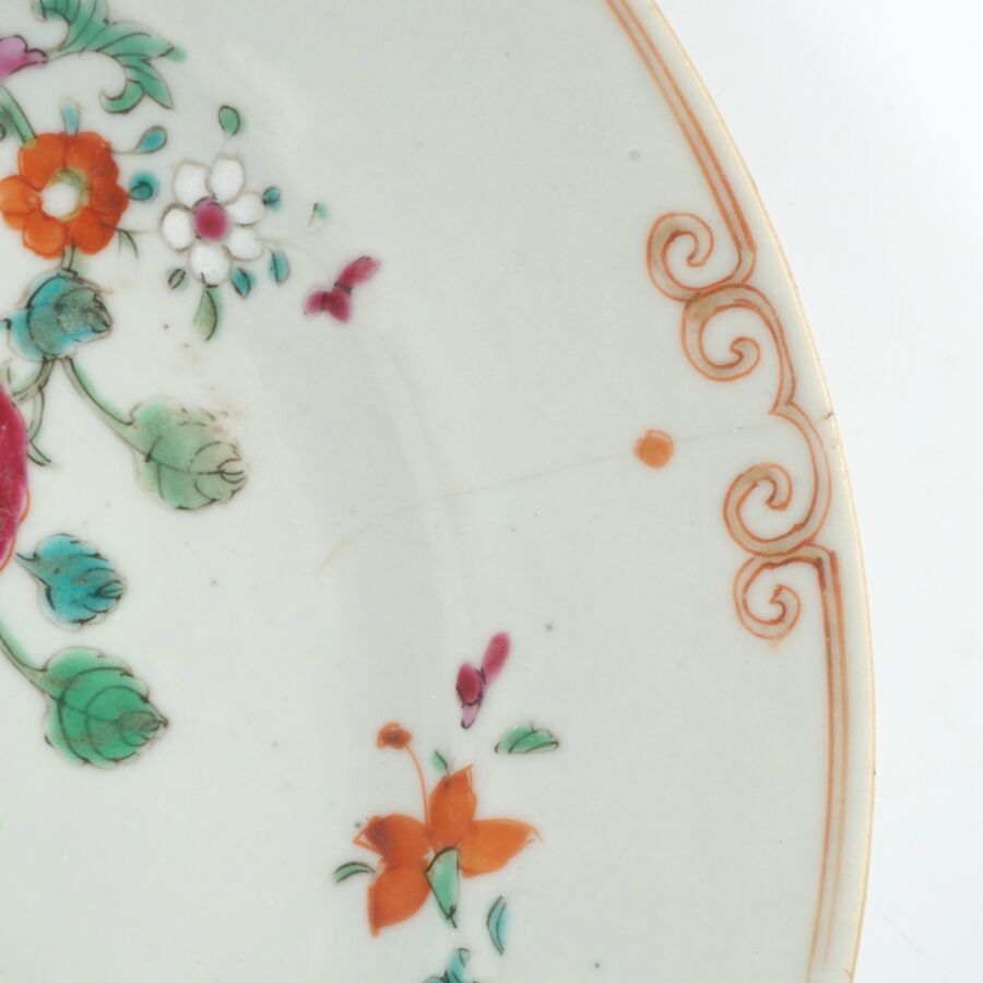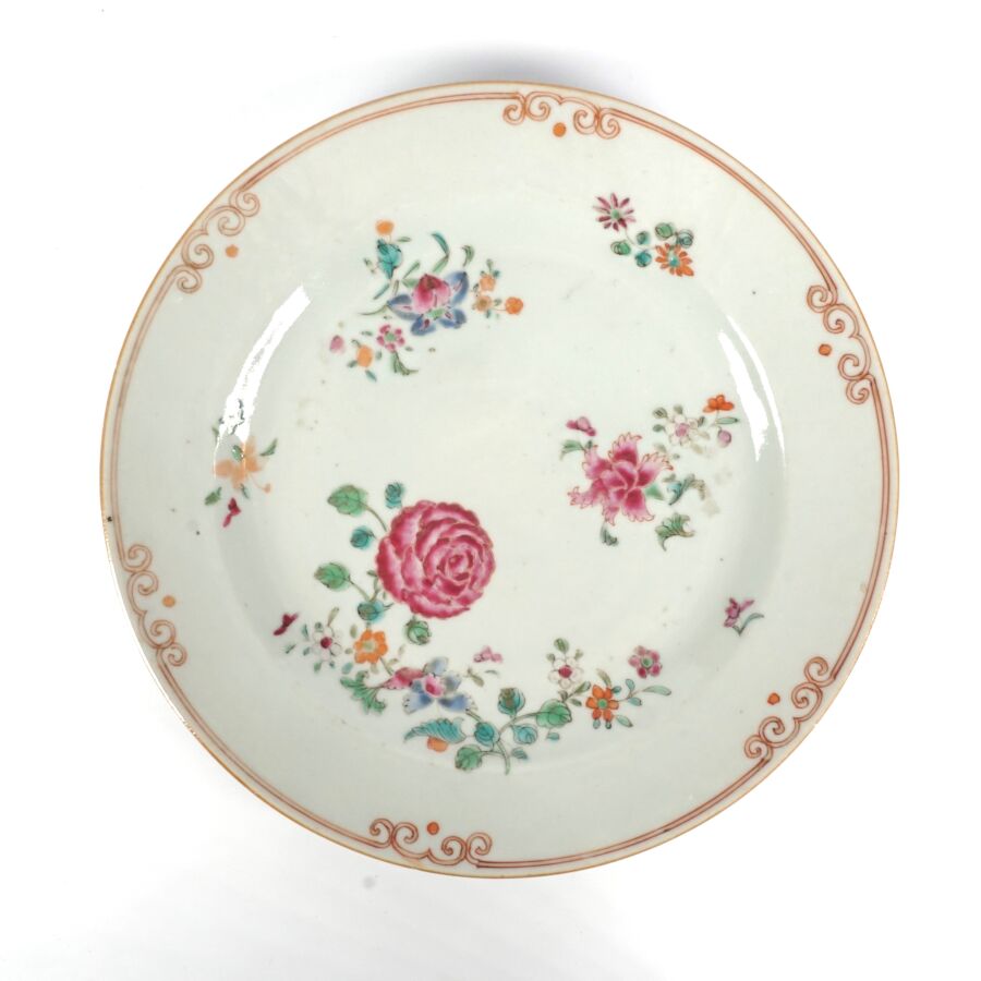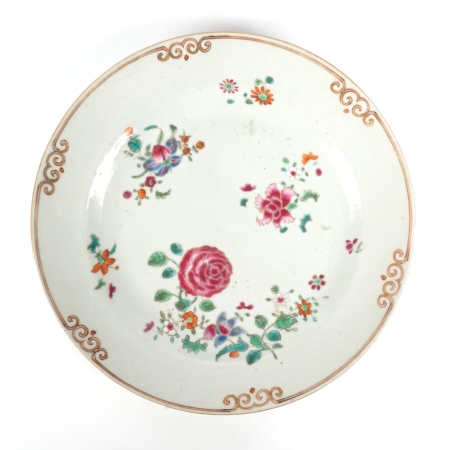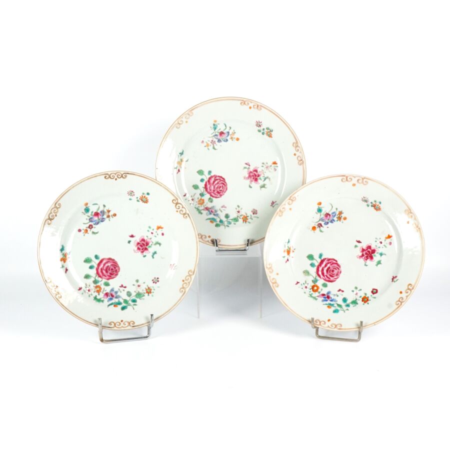 Trois assiettes en porcelaine et émaux de la famille rose, à décor de chrysanthèmes et de fleurs, Compagnie des Indes, Chine, 18ème siècle, D. 22.5 cm (infimes petits éclats en bordure).