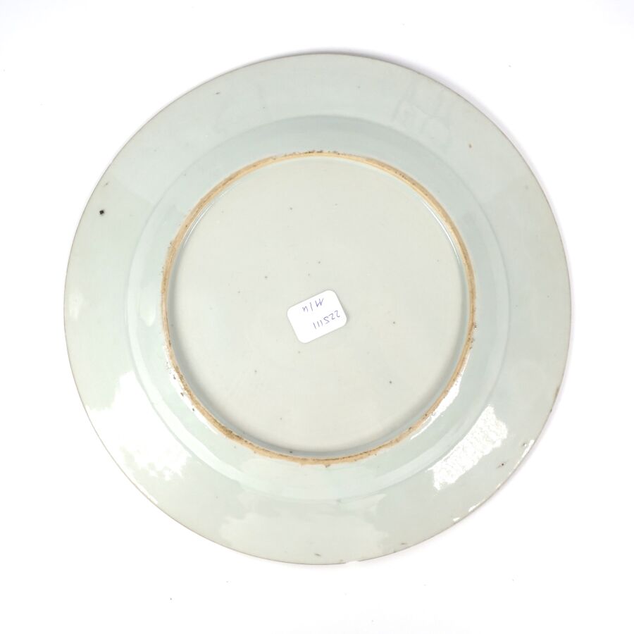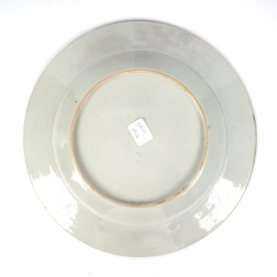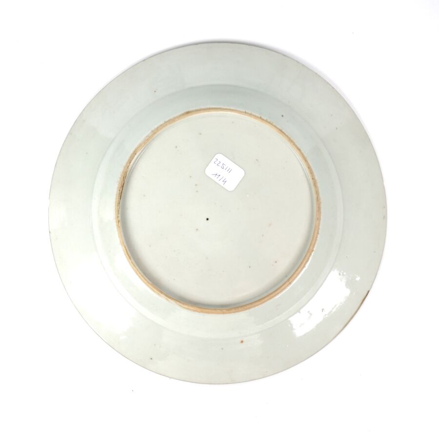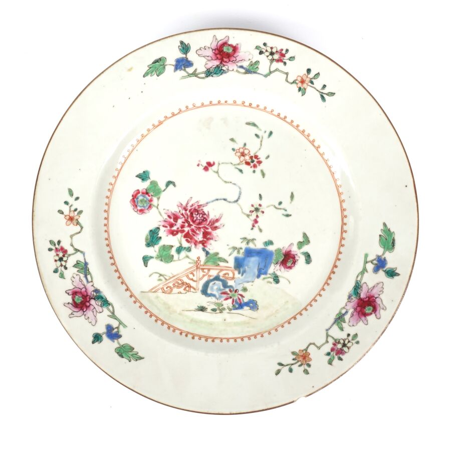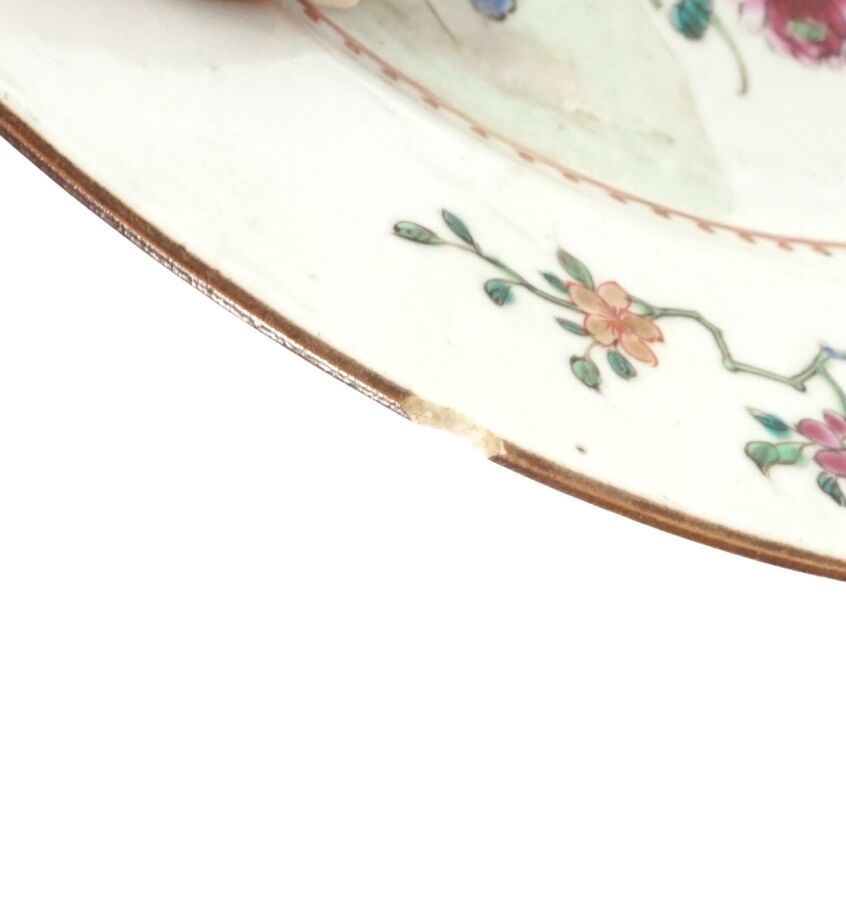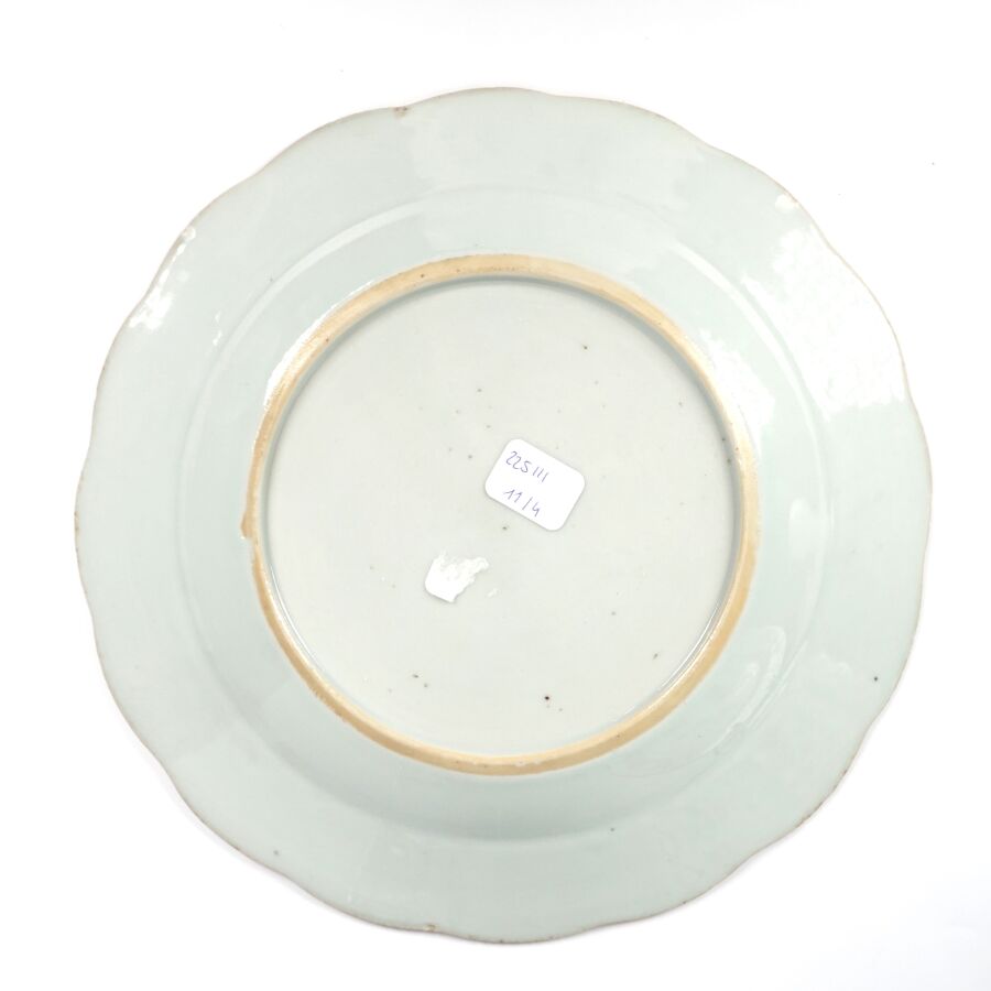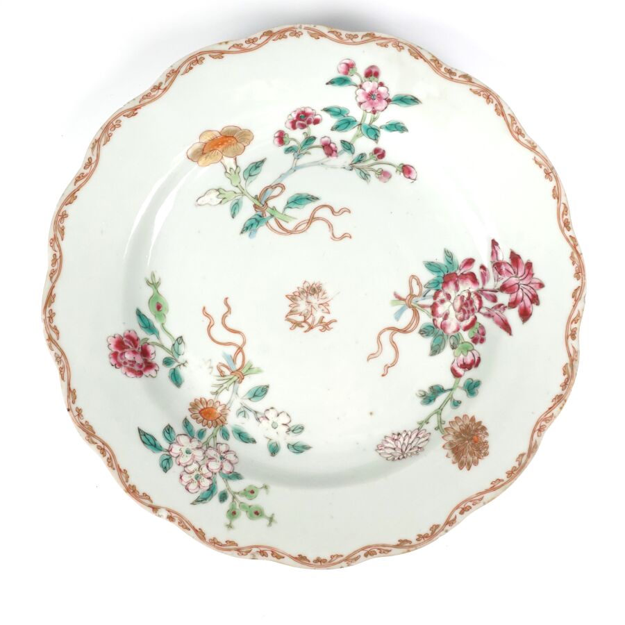 On joint une assiette floriforme en porcelaine et émaux de la famille rose à décor d'un bouquet de fleurs, Chine, Compagnie des Indes, 18ème siècle. D. 22.5 cm (fêles).