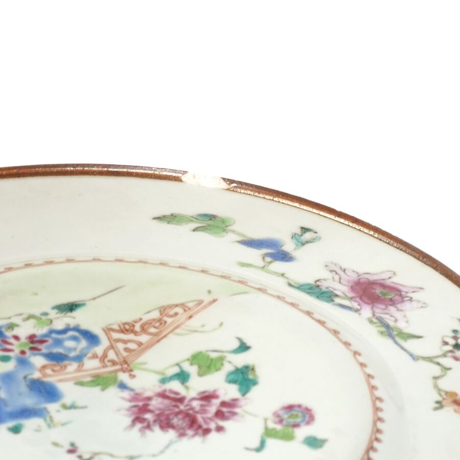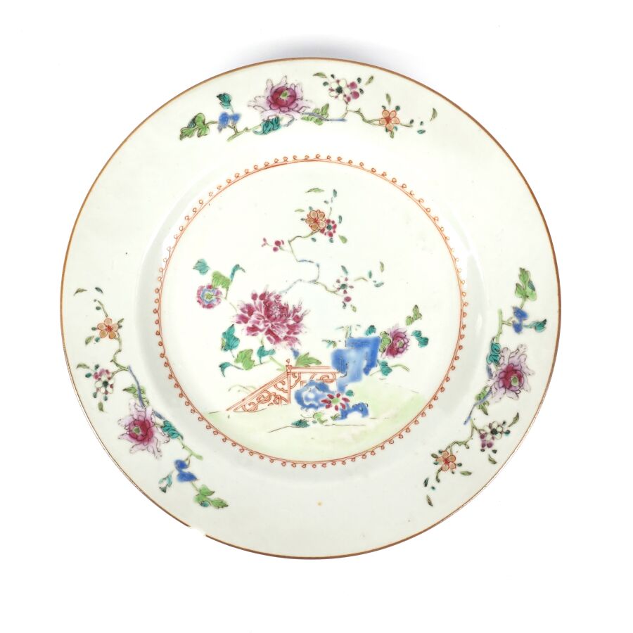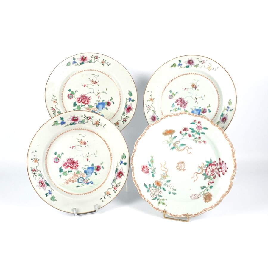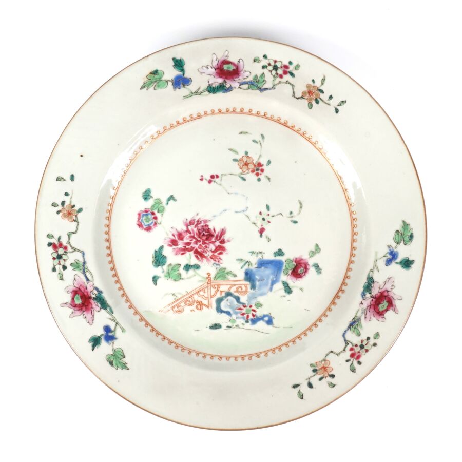 Trois assiettes en porcelaine et émaux de la famille rose à décor d'une terrasse arborée d'un pivoinier en fleur. (D. 22.5 cm environ).