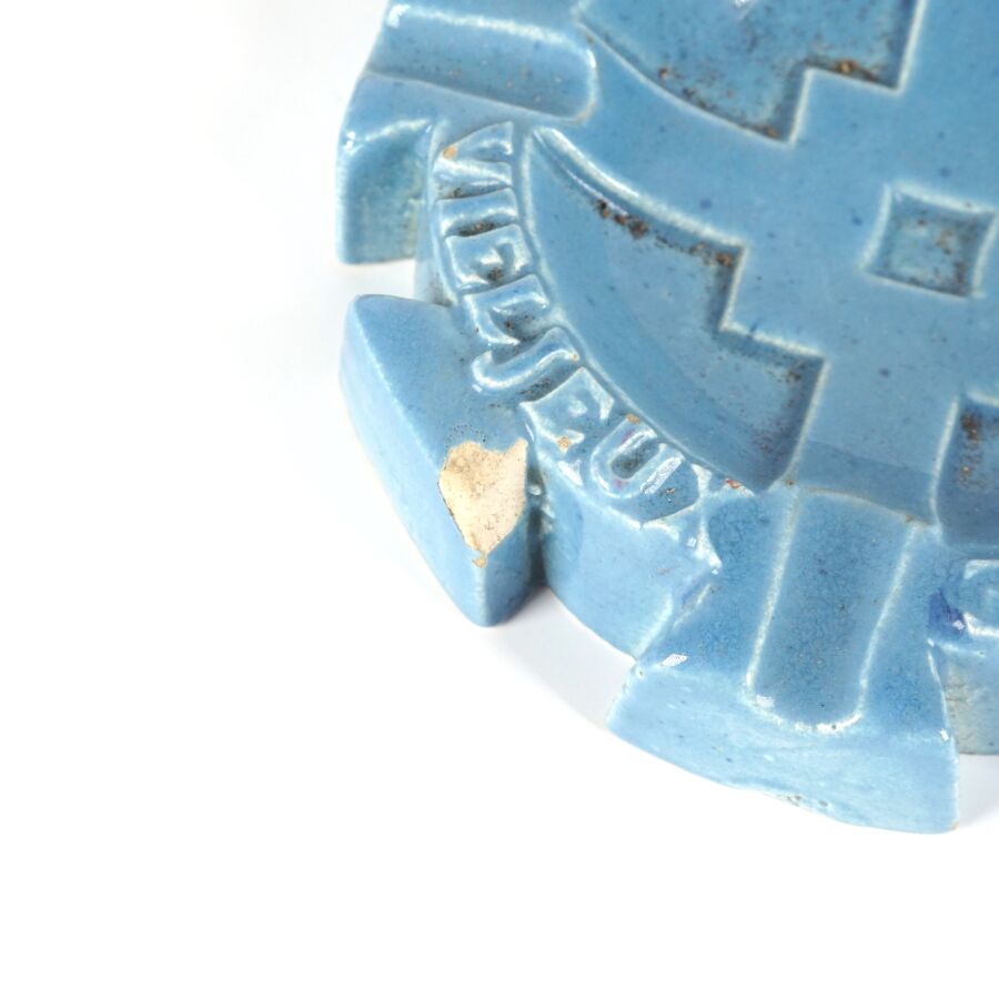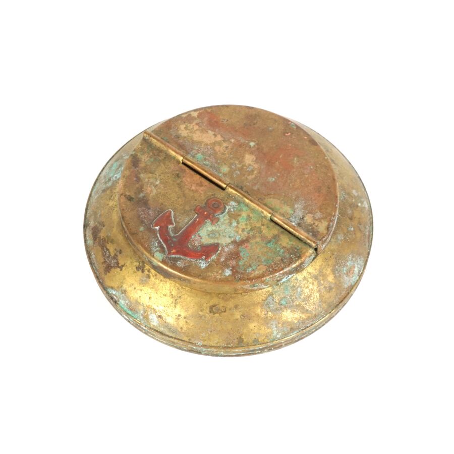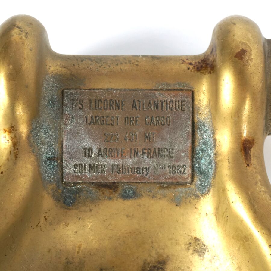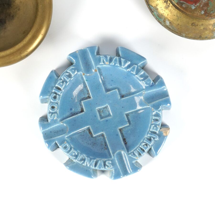 Trois cendriers de Marine en bronze, céramique et métal doré, l'un orné d'une plaque "T/S Licorne Atlantique [...] 1932" (L. 14 cm), le deuxième à double battant orné d'une ancre de marine (Diam. 10.5 cm) et le dernier portant l'inscription moulée "Société Navale Delmas Vieljeux" émaillé en bleu (éclat) (en l'état).