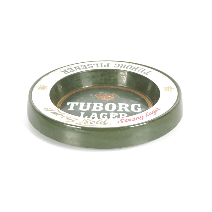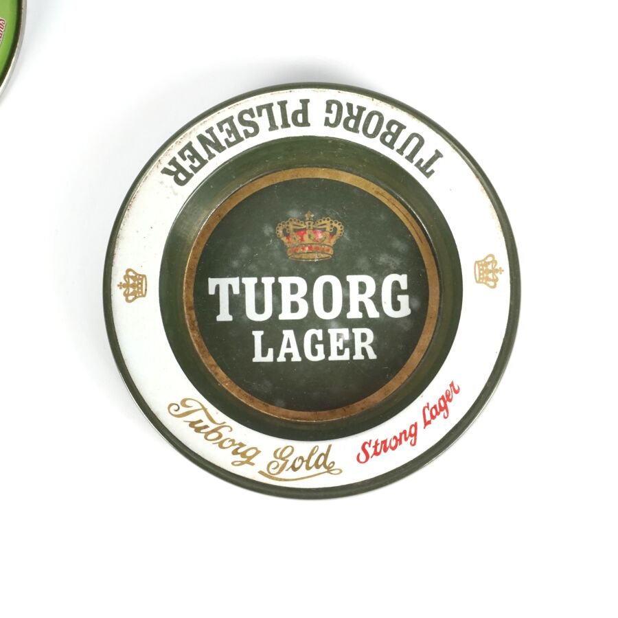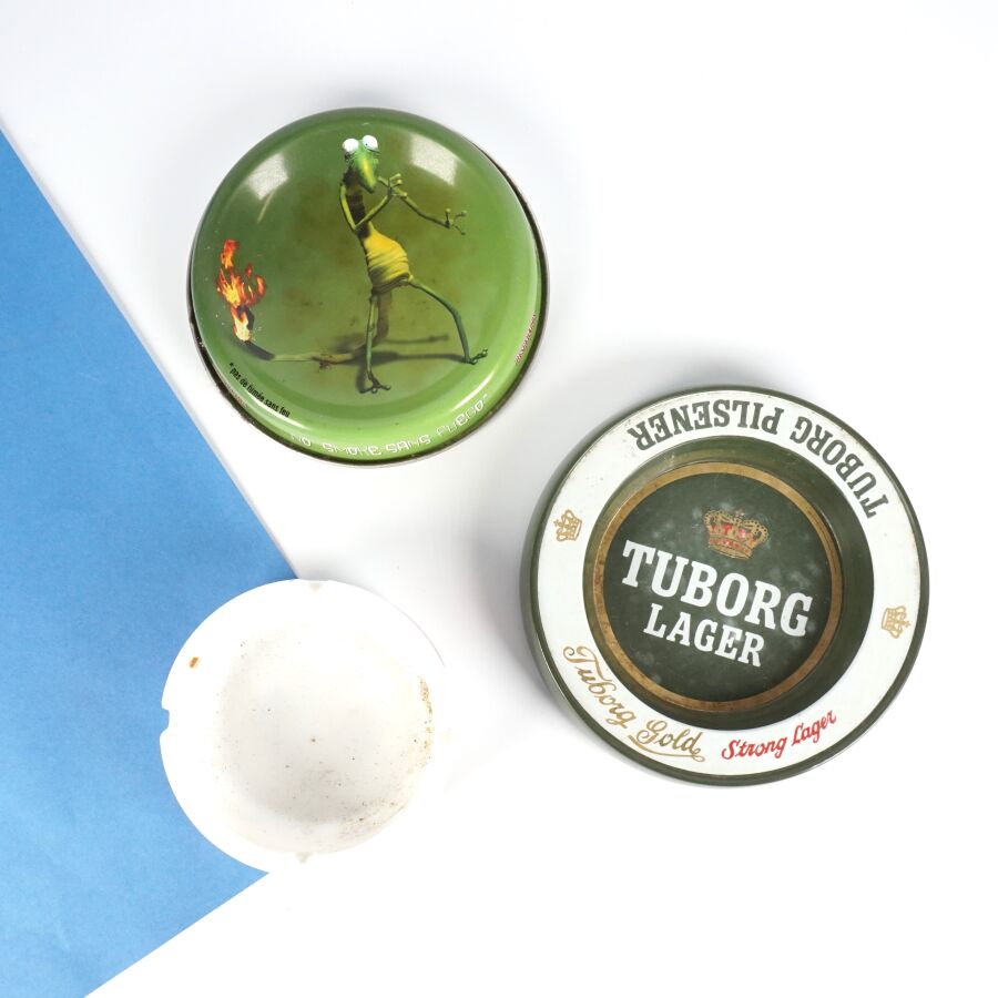 Trois cendriers publicitaires en métal, porcelaine et matière composite comprenant Tuborg, Kronenbourg et Desperados (usures).
