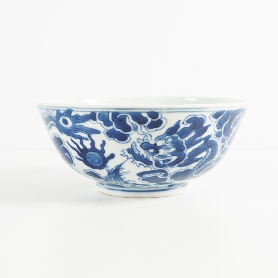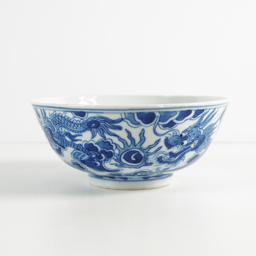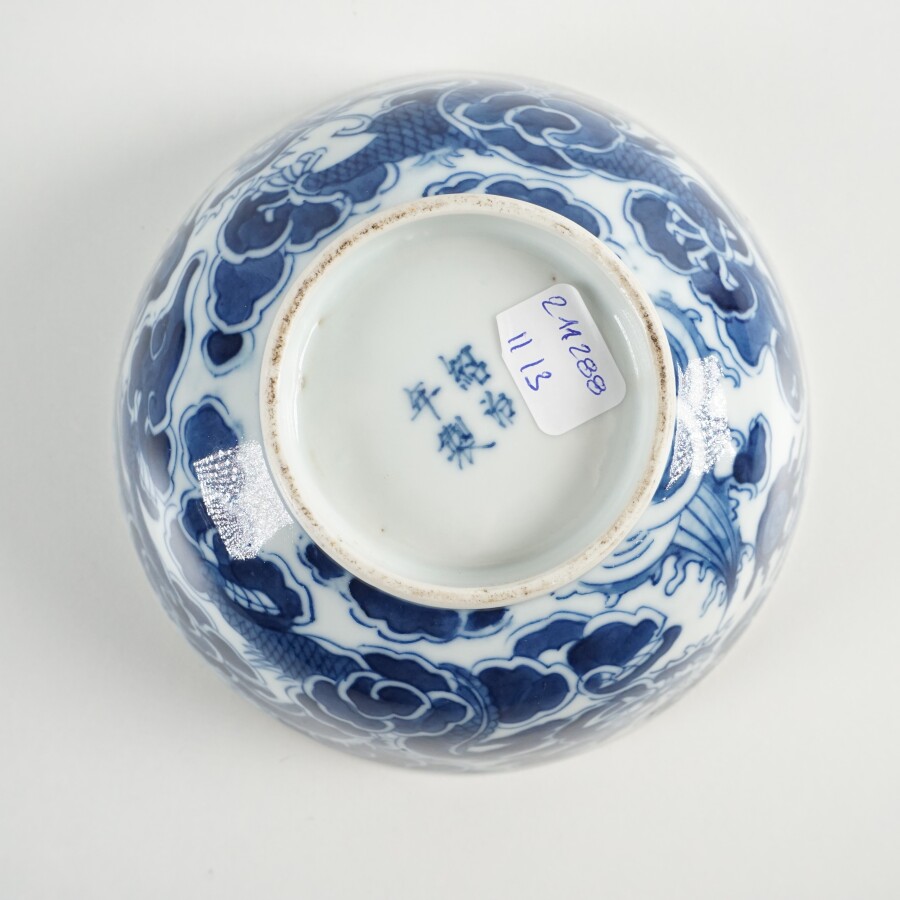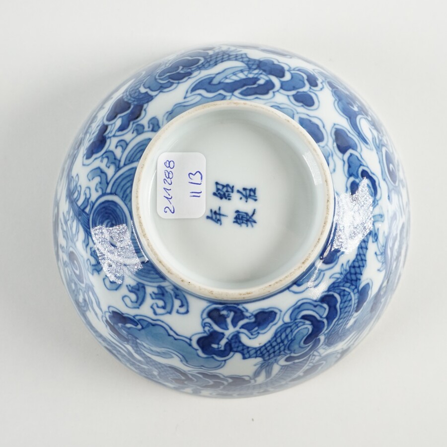 Trois coupes, porcelaine de Hue émaillée en bleu sous couverte à décor de dragons à cinq griffes évoluant parmi des nuages, Vietnam, Diam : 14.6 cm. H. 6.3 cm (infimes égrenures au bord de deux coupes, deux sur l'une et trois sur une deuxième, la troisième en bel état).