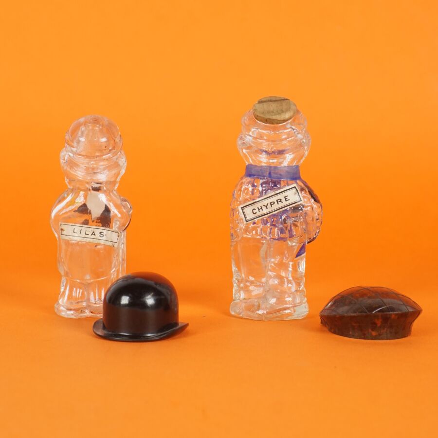 Trois flacons en verre incolore moulé et émaillé polychrome, deux à motifs d'homme au chapeau, un troisième figurant un chien assis, H. 7 cm environ (vide).