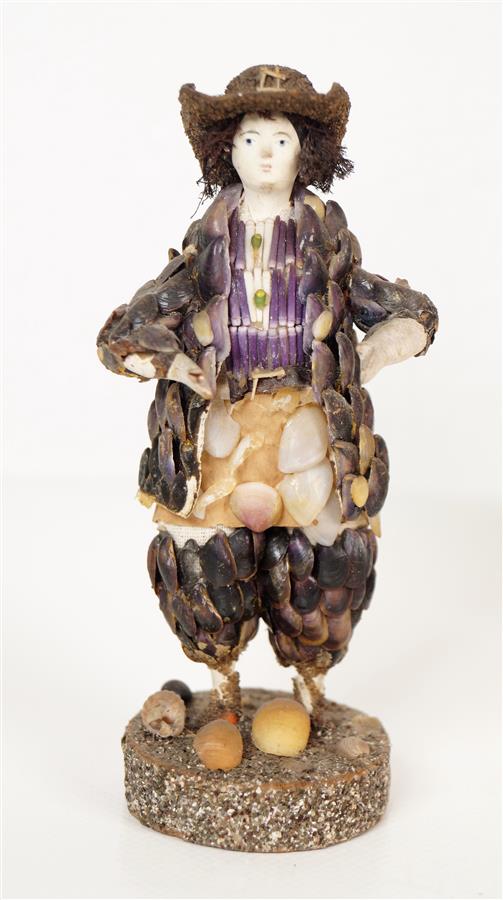 Trois poupées en coquillages, travail de Batz-sur-Mer, dont un couple, et un homme, H. 12 et 20 cm (bel état).