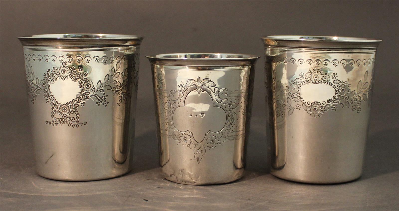 Trois timbales en argent massif, poinçon Minerve, à décor floral et de frises stylisées, l'une monogrammée dans un médaillon "D.F" (l'une avec plusieurs chocs). Poids brut : 298 g environ