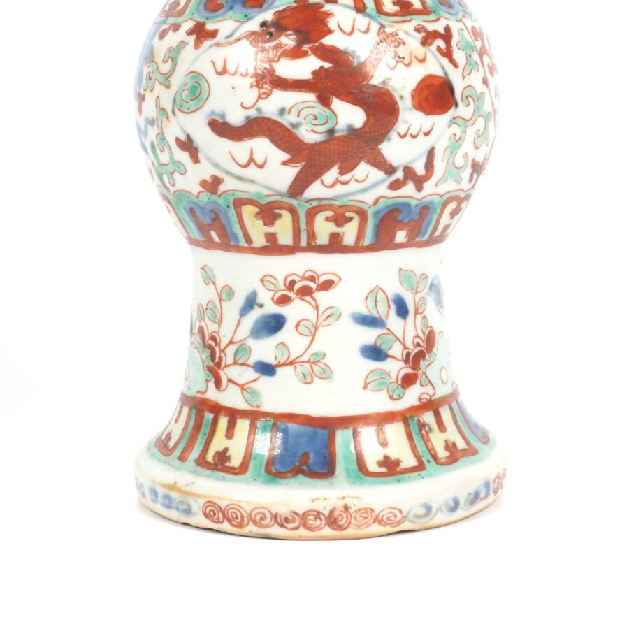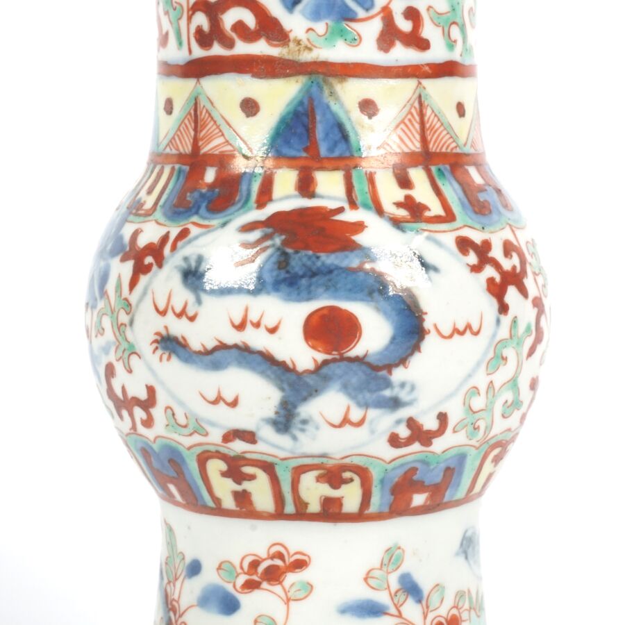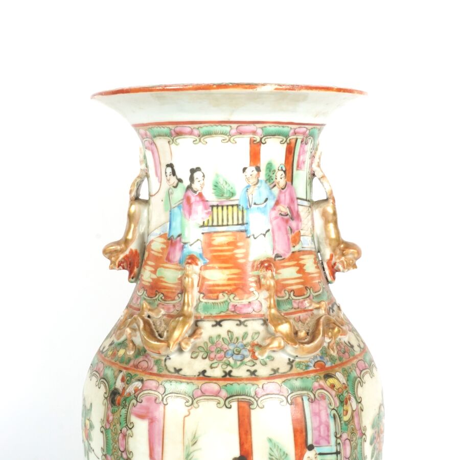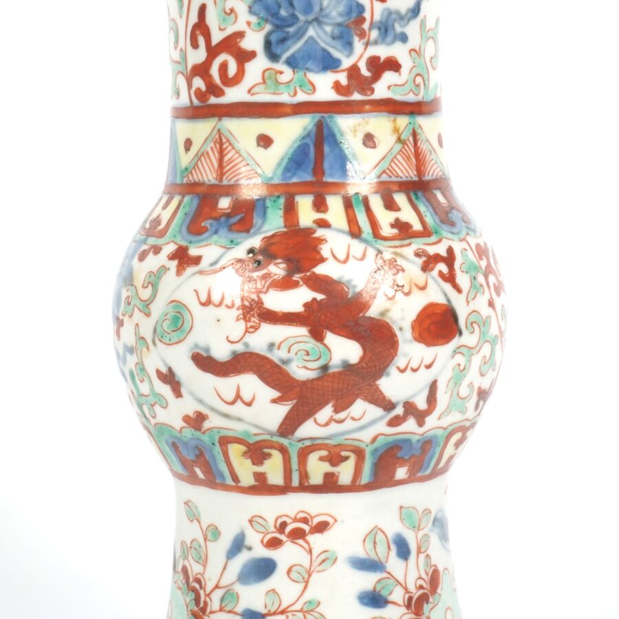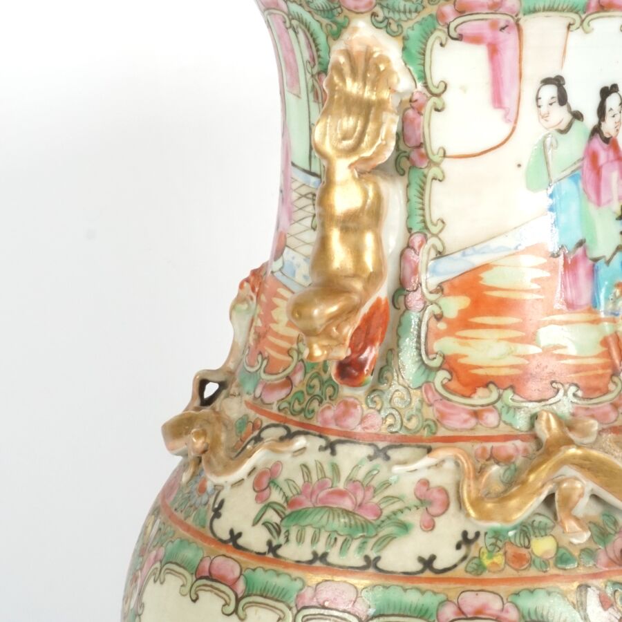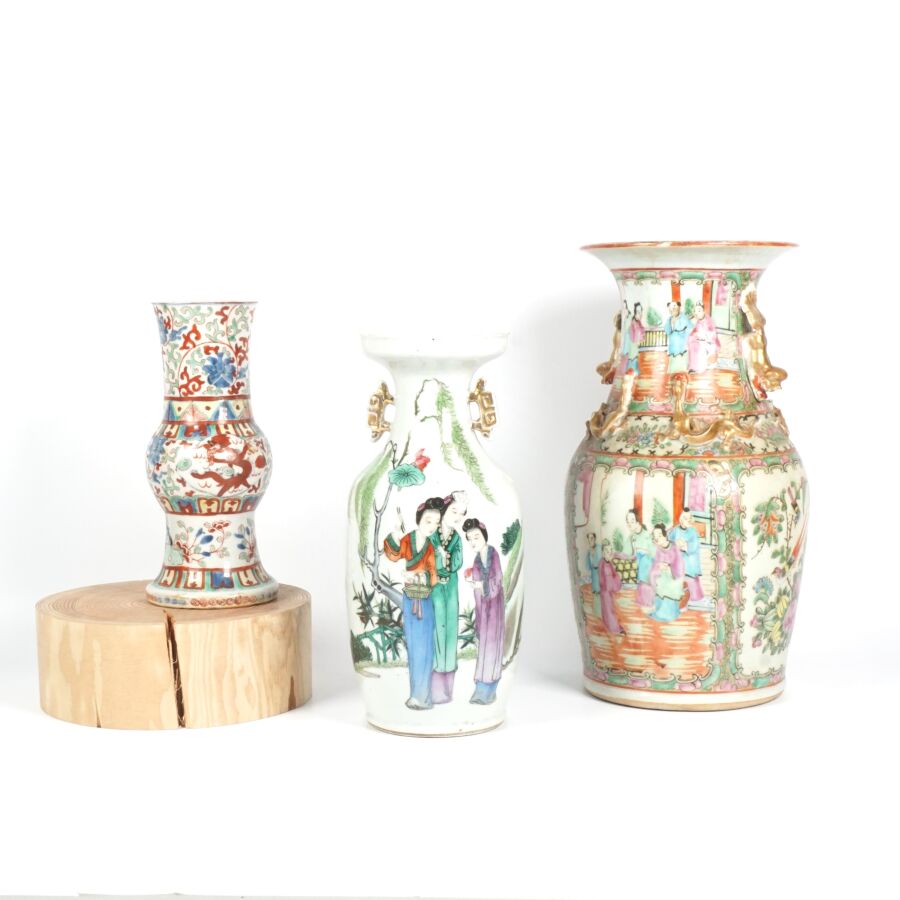 Trois vases en porcelaine comprenant deux vases de forme balustre en porcelaine et émaux polychromes et de style famille rose à décor de personnages et une partie de vase (col coupé) en porcelaine et émaux de style Wucai (dans le goût de l'époque Wanli) à décor de dragons, fleurs et rinceaux feuillagés, marque apocryphe Ming au revers, Chine, Canton, fin du 19ème siècle et début du 20ème siècle circa 1900, H. 21 cm. H. 32 cm. H. 26 cm (petits éclats et fêle).
