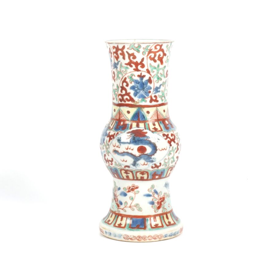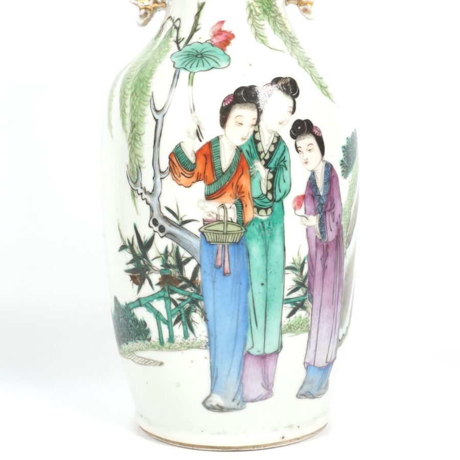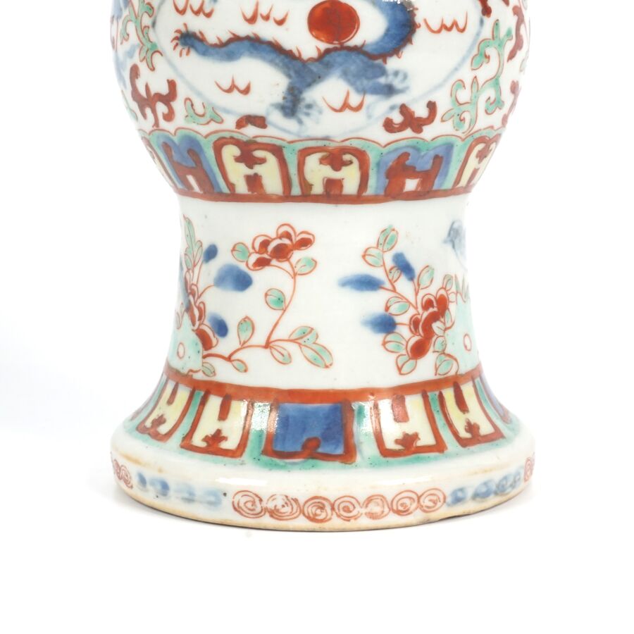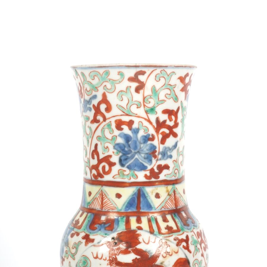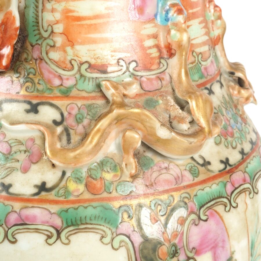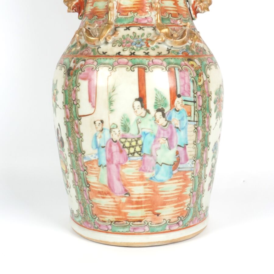 Trois vases en porcelaine comprenant deux vases de forme balustre en porcelaine et émaux polychromes et de style famille rose à décor de personnages et une partie de vase (col coupé) en porcelaine et émaux de style Wucai (dans le goût de l'époque Wanli) à décor de dragons, fleurs et rinceaux feuillagés, marque apocryphe Ming au revers, Chine, Canton, fin du 19ème siècle et début du 20ème siècle circa 1900, H. 21 cm. H. 32 cm. H. 26 cm (petits éclats et fêle).