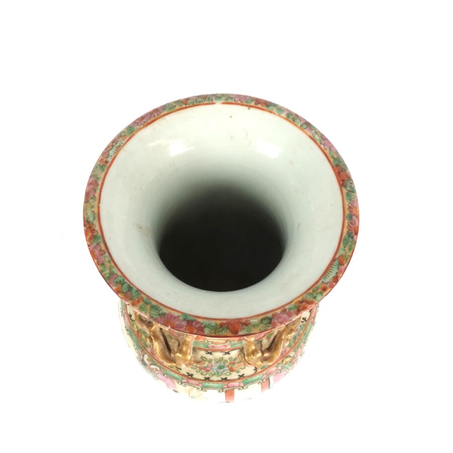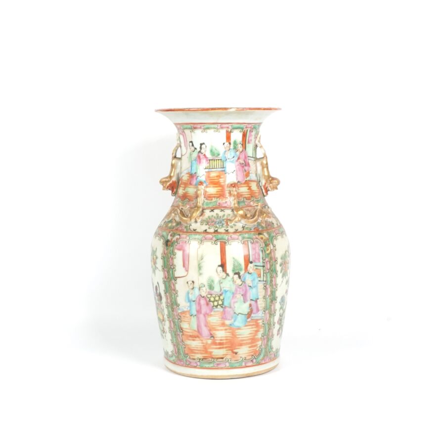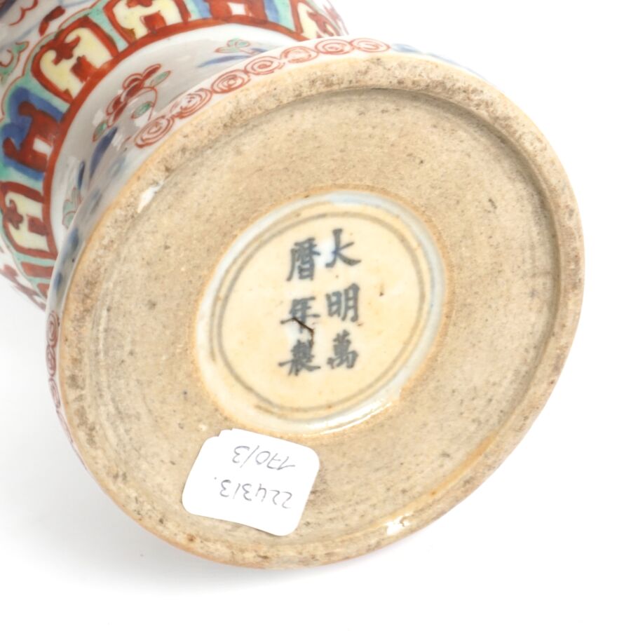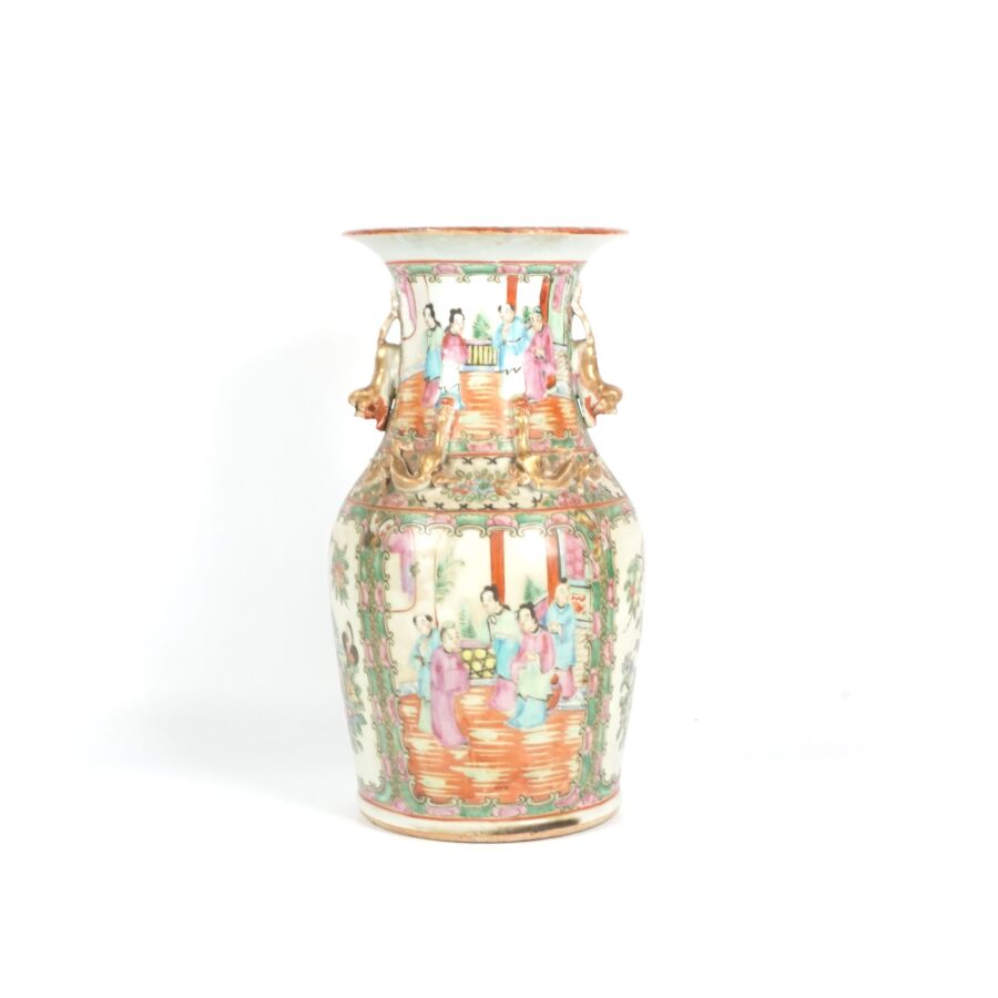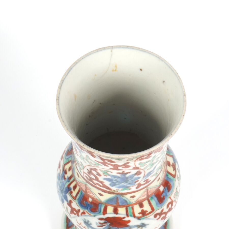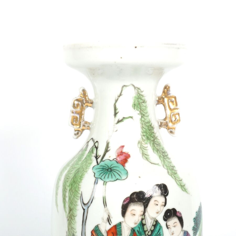 Trois vases en porcelaine comprenant deux vases de forme balustre en porcelaine et émaux polychromes et de style famille rose à décor de personnages et une partie de vase (col coupé) en porcelaine et émaux de style Wucai (dans le goût de l'époque Wanli) à décor de dragons, fleurs et rinceaux feuillagés, marque apocryphe Ming au revers, Chine, Canton, fin du 19ème siècle et début du 20ème siècle circa 1900, H. 21 cm. H. 32 cm. H. 26 cm (petits éclats et fêle).