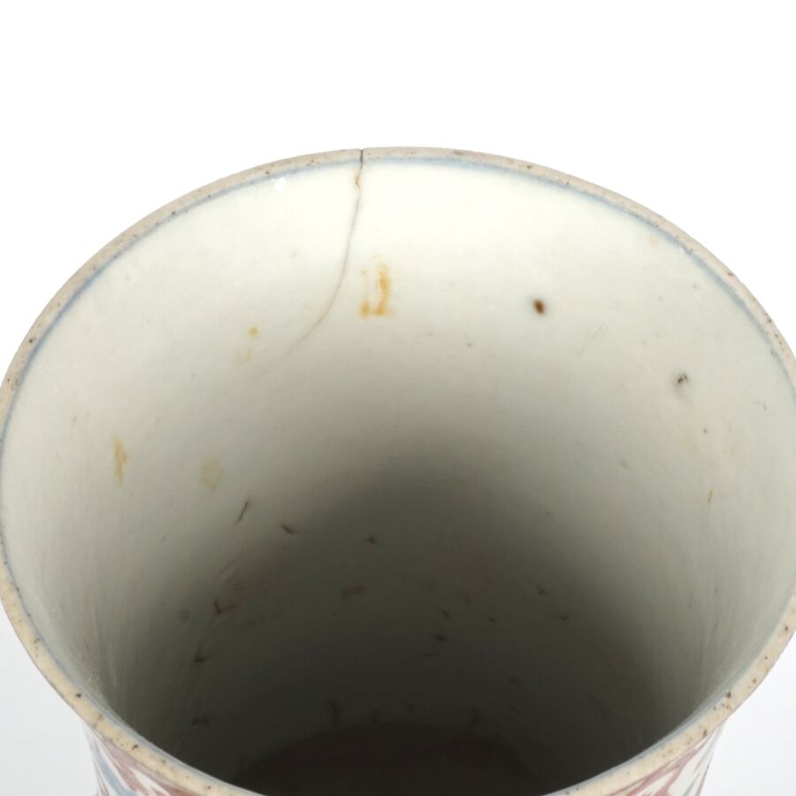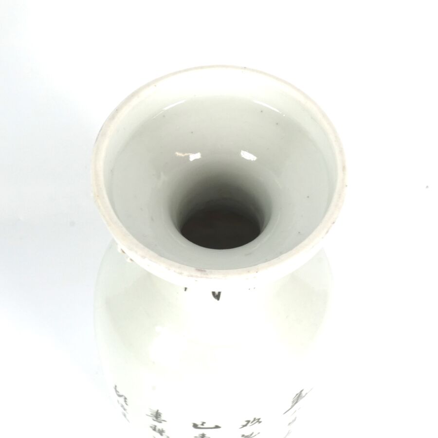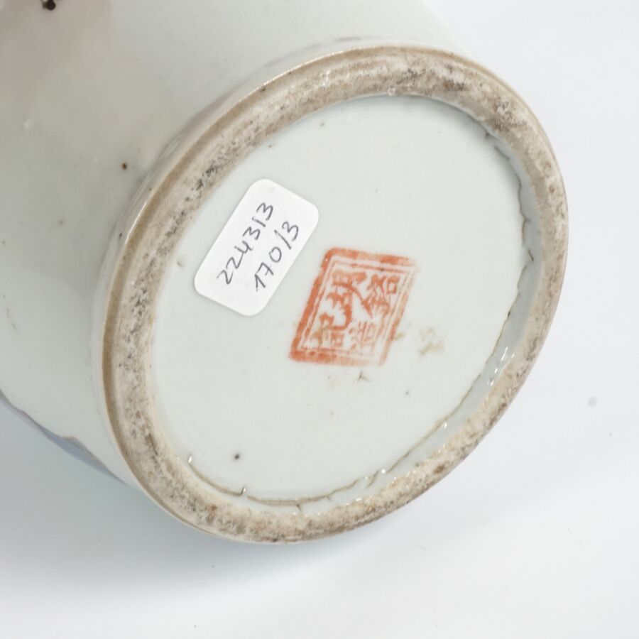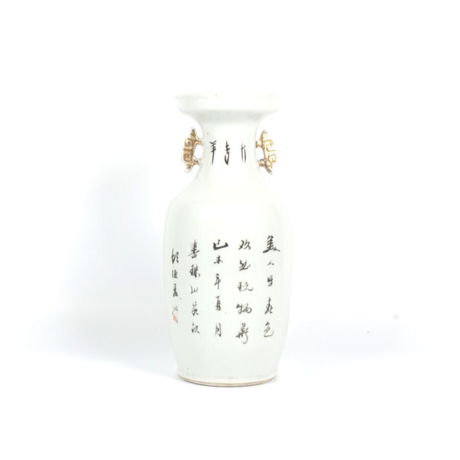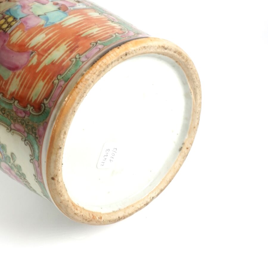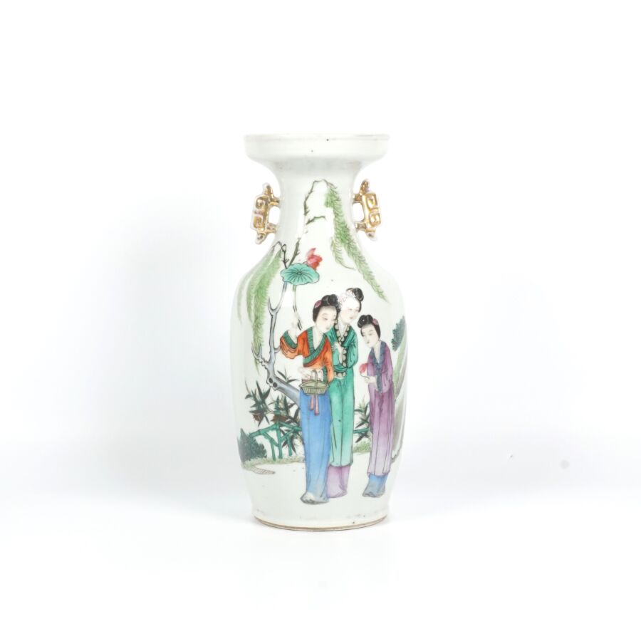 Trois vases en porcelaine comprenant deux vases de forme balustre en porcelaine et émaux polychromes et de style famille rose à décor de personnages et une partie de vase (col coupé) en porcelaine et émaux de style Wucai (dans le goût de l'époque Wanli) à décor de dragons, fleurs et rinceaux feuillagés, marque apocryphe Ming au revers, Chine, Canton, fin du 19ème siècle et début du 20ème siècle circa 1900, H. 21 cm. H. 32 cm. H. 26 cm (petits éclats et fêle).