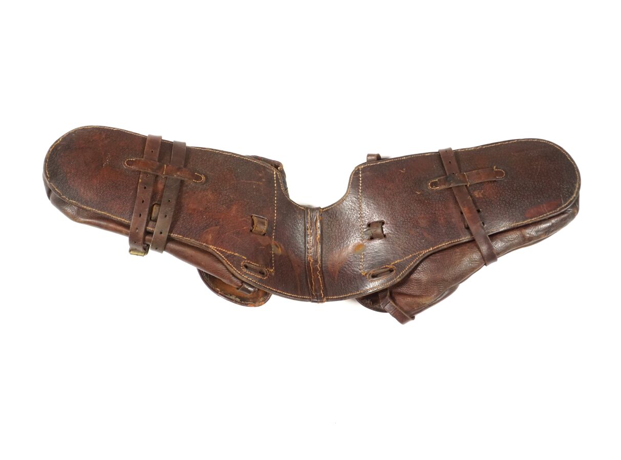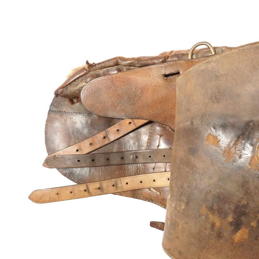 [TROUPES D'AFRIQUE] - SELLE DE CHEVAL D'OFFICIER, en cuir marron, plaque rectangulaire nominative marquée " CAPITAINE LEFRANC ", ancre de marine de chaque côté et traduction en langue arabe au-dessous, premier tiers XXème, TBE.