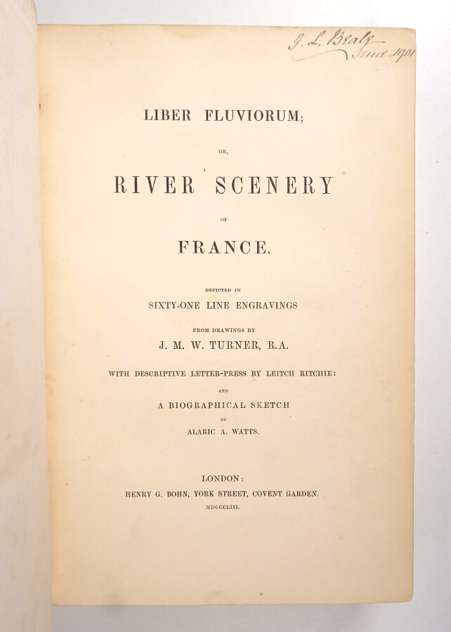 TURNER (Joseph Mallord William) - Liber Fluviorum ; or River Scenery of France. Depicted in sixty-one line engravings [] with descriptive letter-press by Leitch Ritchie and a biographical sketch by Alaric A. Watts - Londres ; Henry G. Bohn, 1853 - 1 volume grand In-8° - 4ème garde blanche manuscrite et 61 gravures sur acier dont frontispice (légèrement roussi et auréolé à 1 angle) par William Turner - Reliure restaurée de l'époque demi-basane marine à coins - Dos à nerfs orné (restauré et cuir craquelé) - Pièce de titre maroquin bordeaux - Tranches dorées - Ex-libris manuscrit au titre - Assez bon exemplaire.