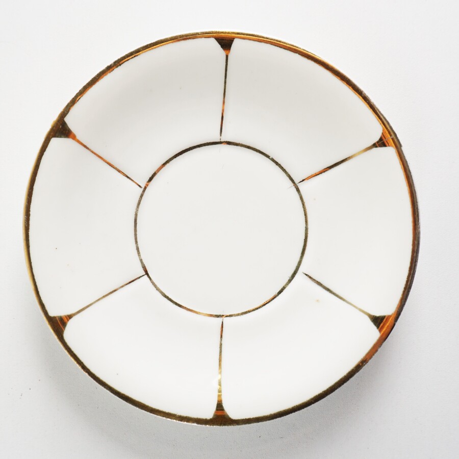 UF FRANCE : Partie de service à café en porcelaine émaillée blanche, à décor de liserés dorés comprenant : une cafetière, un sucrier, un pot à lait, 11 tasses et 12 soucoupes, début 20ème, H. Cafetière : 22.5 cm (quelques éclats, petites usures).